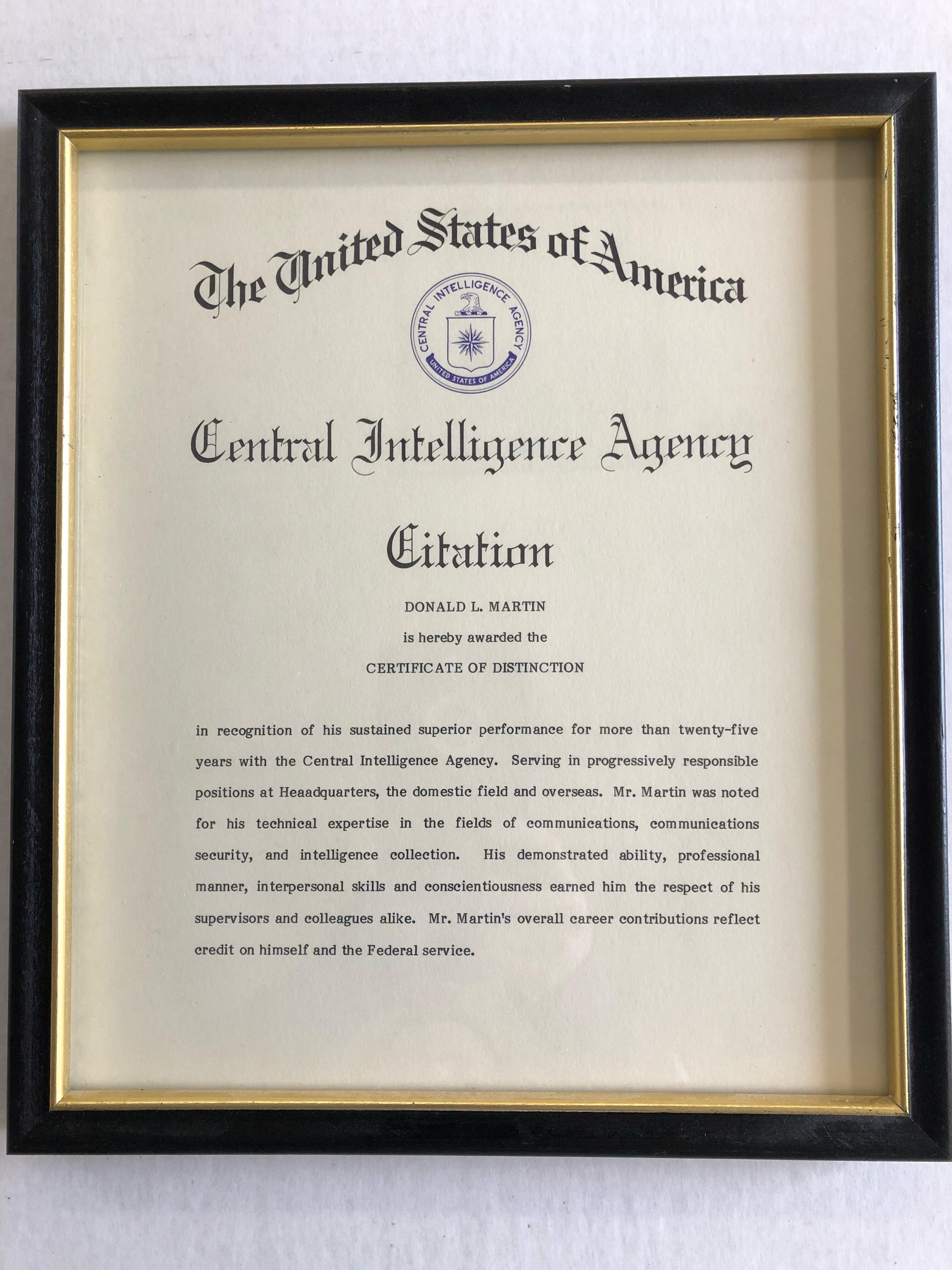 The United States of America; Central Intelligence Agency Citation; Donald L. Martin is hereby awarded the Certificate of Distinction in recognition of his sustained superior performance for more than twenty-five years with the Central Intelligence Agency. Serving in progressively responsible positions at Headquarters, the domestic field and overseas. Mr. Martin was noted for his technical expertise in the fields of communications, communications security, and intelligence collection. His demonstrated ability, professional manner, interpersonal skills and conscientiousness earned him the respect of his supervisors and colleagues alike. Mr. Martin's overall career contributions reflect credit on himself and the Federal service.Language
