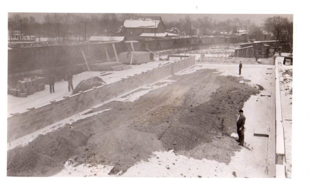 Falls Steel Tube, foundations poured for part of side wall. Lumber being unloaded. Part of slag fill being dumped with rounds of tar.Photograph Details