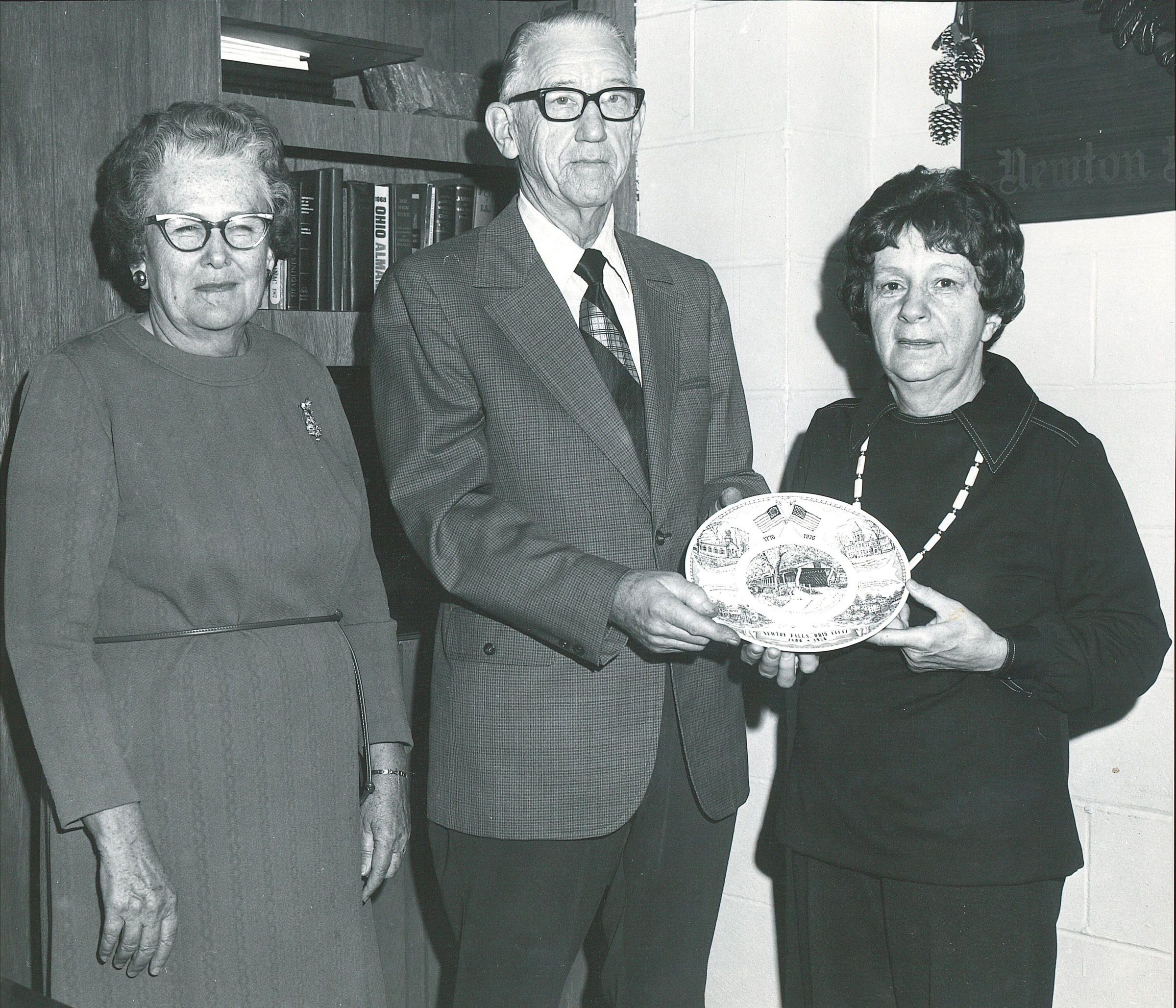 L-R: Ann Grim, Byron Wassink, and Anne Hallett displaying the newly shipped Newton Falls Bicentennial plate. Ann Grim helped design the plate. Byron, chairman of the Newton Falls Bicentennial Committee, presents a plate to Anne Hallett, who won it at a dinner.Photograph Details