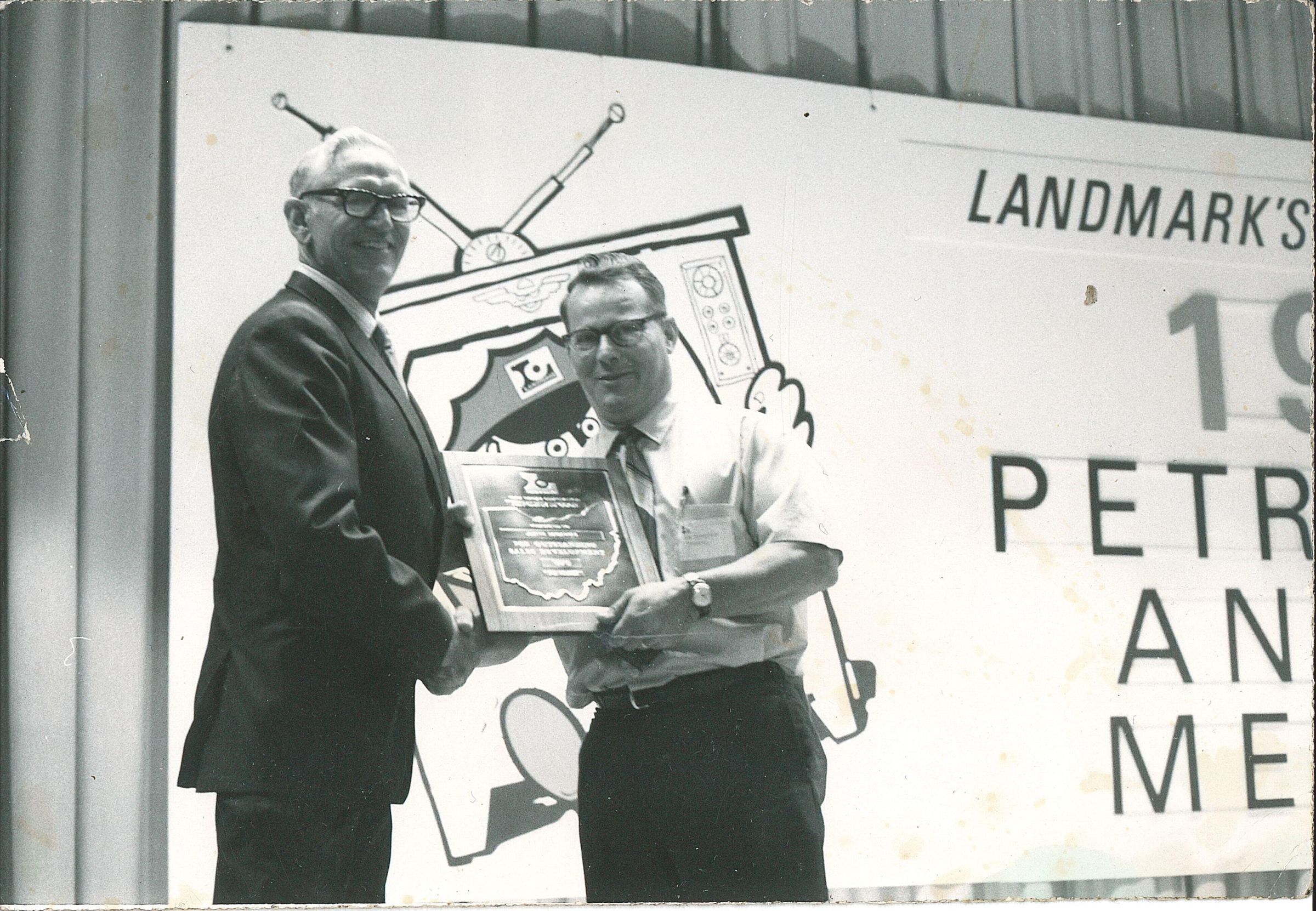 Joseph Sonderman, right, manager of the Trumbull County Landmark Farm Bureau Cooperative, receives a manager's plaque award from Area Petroleum representative Melvin Siedel.Photograph Details