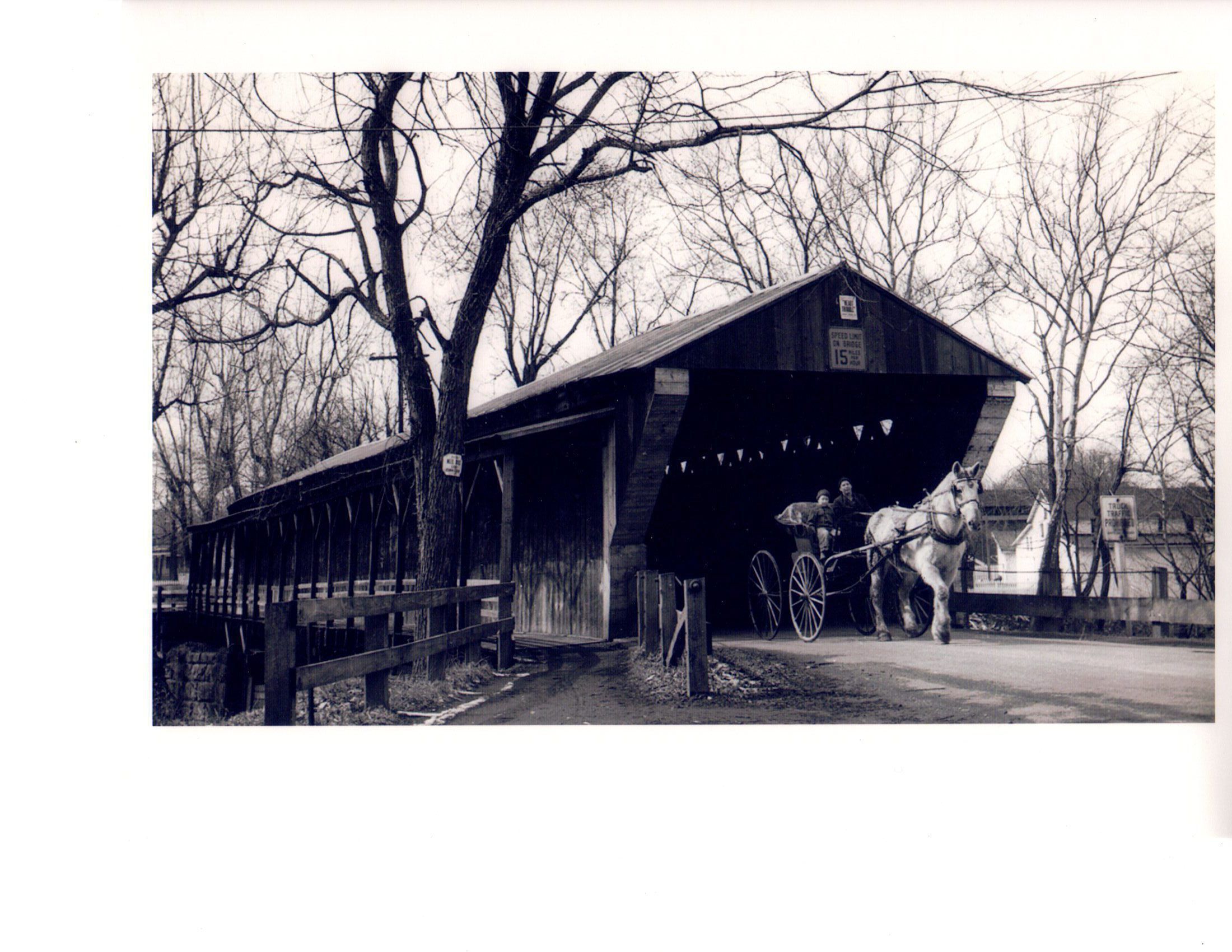 The East Covered Bridge over the east branch of the Mahoning River. Person driving the buggy is Minnie Zeigler.Photograph Details