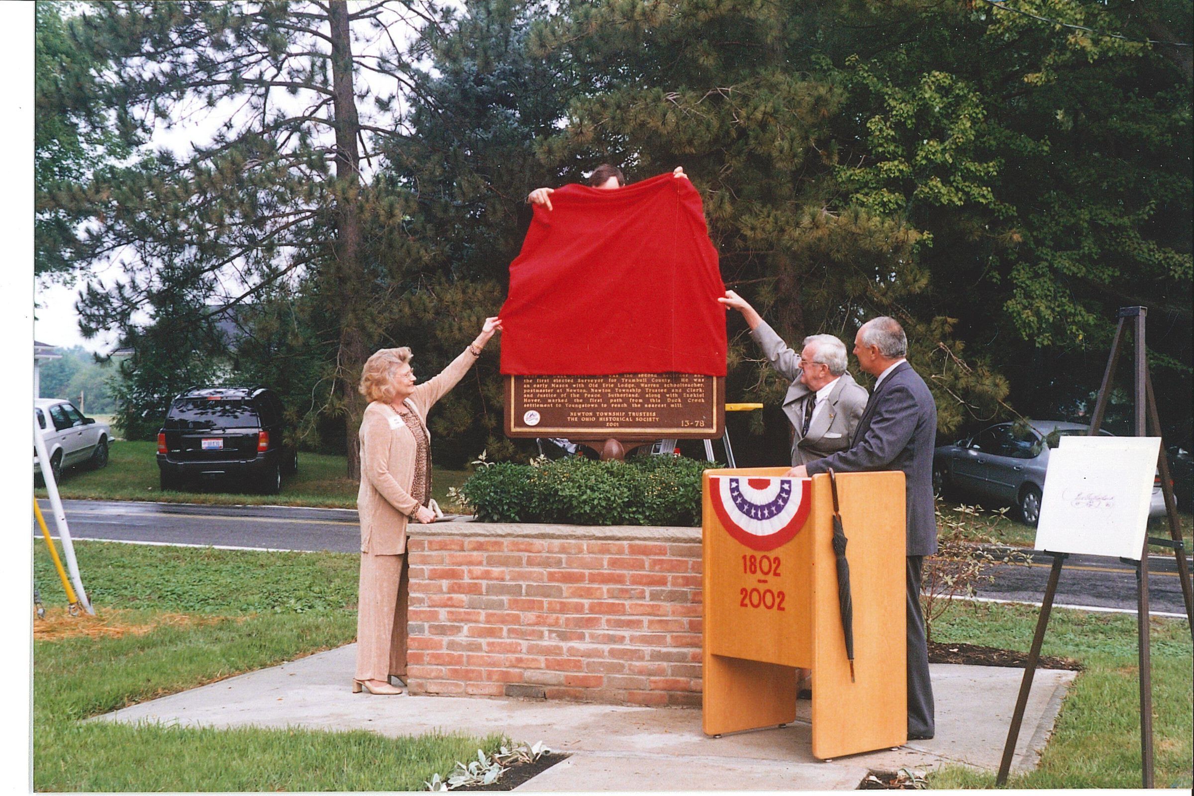 Newton Township celebrated its bicentennial by erecting a plaque at the intersection of Hallock-Young and Hallock-Sook Road in honor of its first settlers, Alexander and Sarah Sutherland. Township trustee Peter J. Augusta unveils the historical marker as other township officials look on. L-R: Kay Lingo, township clerk; George Prelac, township trustee; and Delbert Woloski, township trustee and chairman.Photograph Details