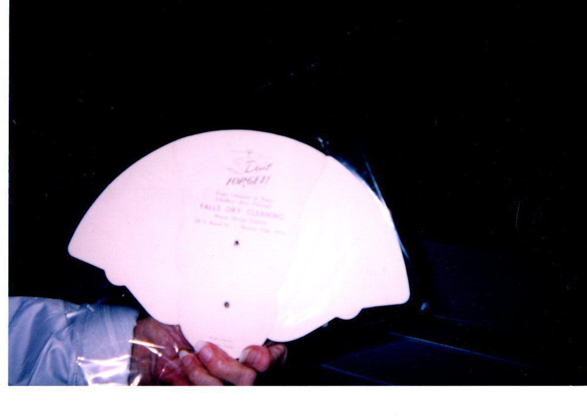 Velma Jones Jacobs holds the back of the card which reads Falls Dry Cleaning. Velma is a collector of such items.Photograph Details
