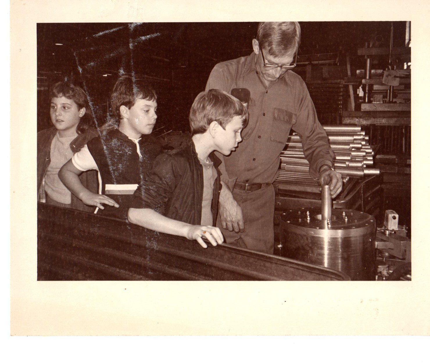 Fifth grade students of Mrs. Marilyn Liber visited Falls Sheet Tube to learn how the industrial plant operations. Mr. Plummer Bryant demonstrates a hole pancake machine.Photograph Details