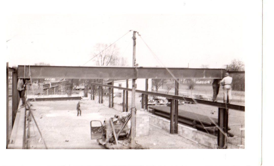 Falls Steel Tube, erecting steel during the week of March 29 to April 5th 1948. Picture taken from roof of steel storage.Photograph Details