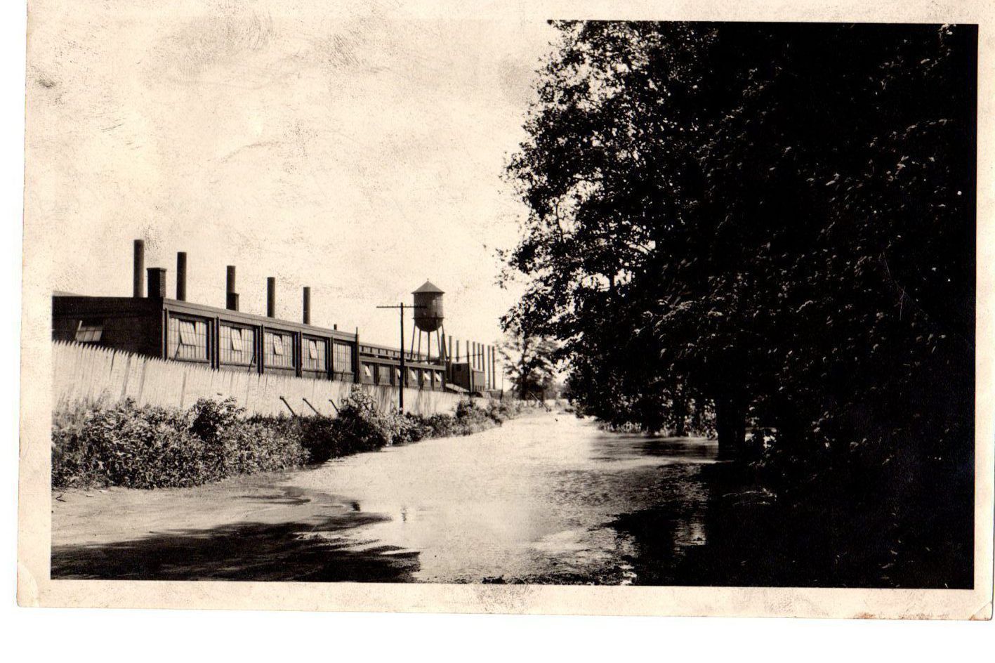 The flood of 1913. Shows First Street (once referred to as the "Old Mill Rd" flooded. Street is in middle of the photo. Newton Steel is on the left.Photograph Details