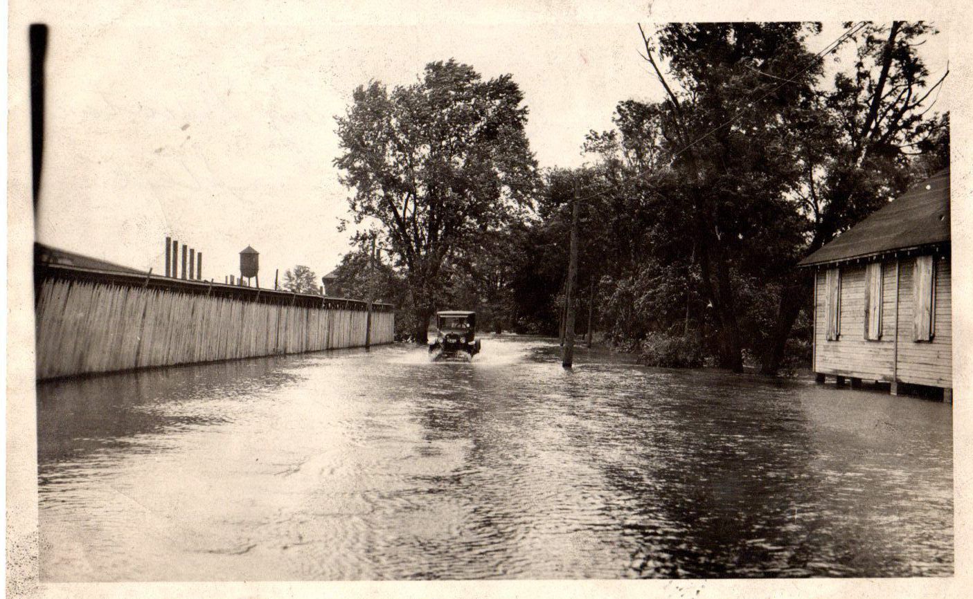 The flood of 1913. Photo shows First Street flooded, Newton Steel on the left. This photo was in the house at 27 South Canal St (corner of S. Canal and Liberty St.) when Dr. Mealy sold the house to Dr. Mathie.Photograph Details