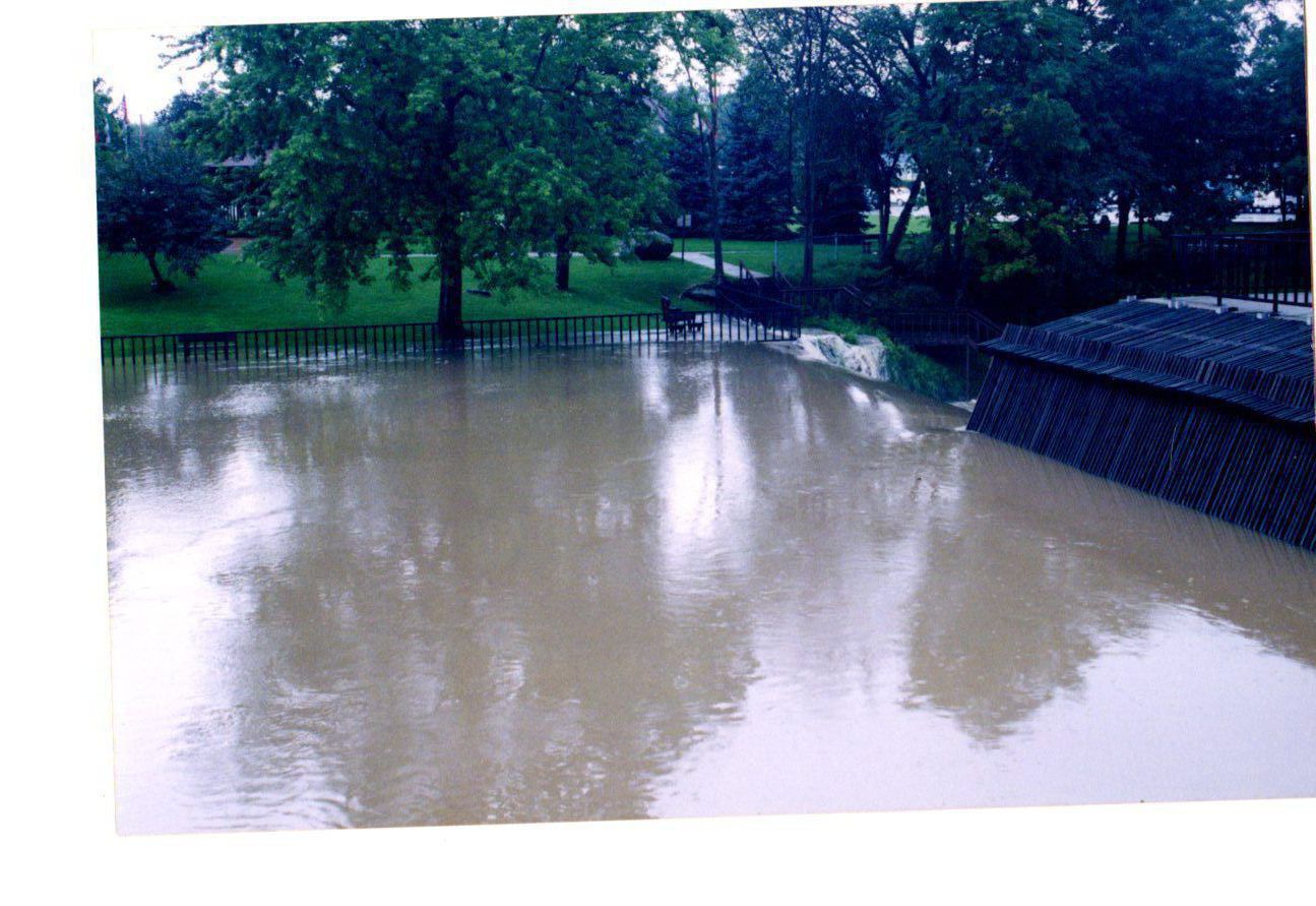 The July 2003 flood. Shows flood water running from Mahoning River at the West Branch Falls. Veteran's Park is in the background.Photograph Details