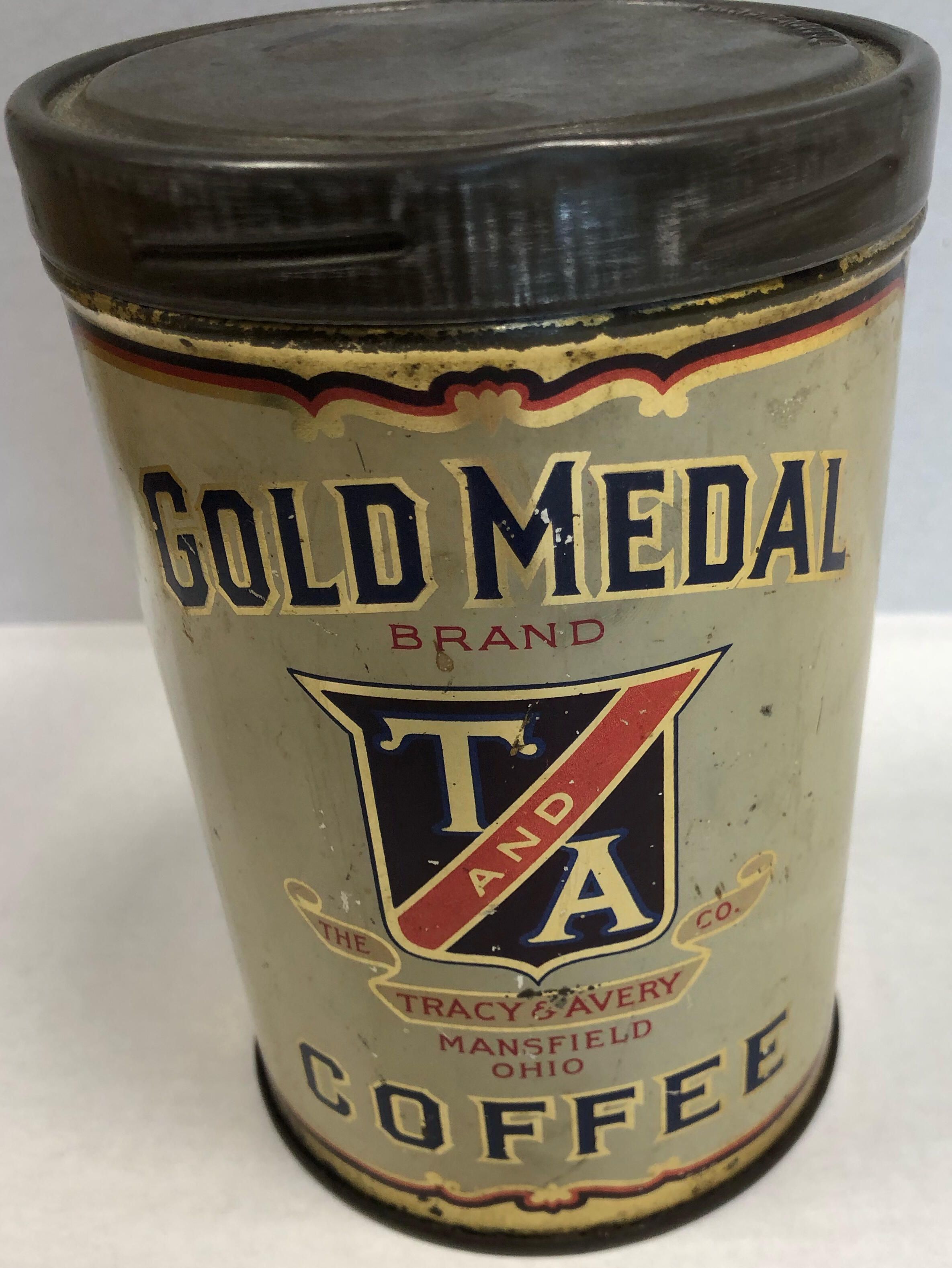 Gold Medal brand coffee can from The Tracy & Avery Company in Mansfield, Ohio. Circa 1923. Belonged to Helen Gonzales.Acquisition