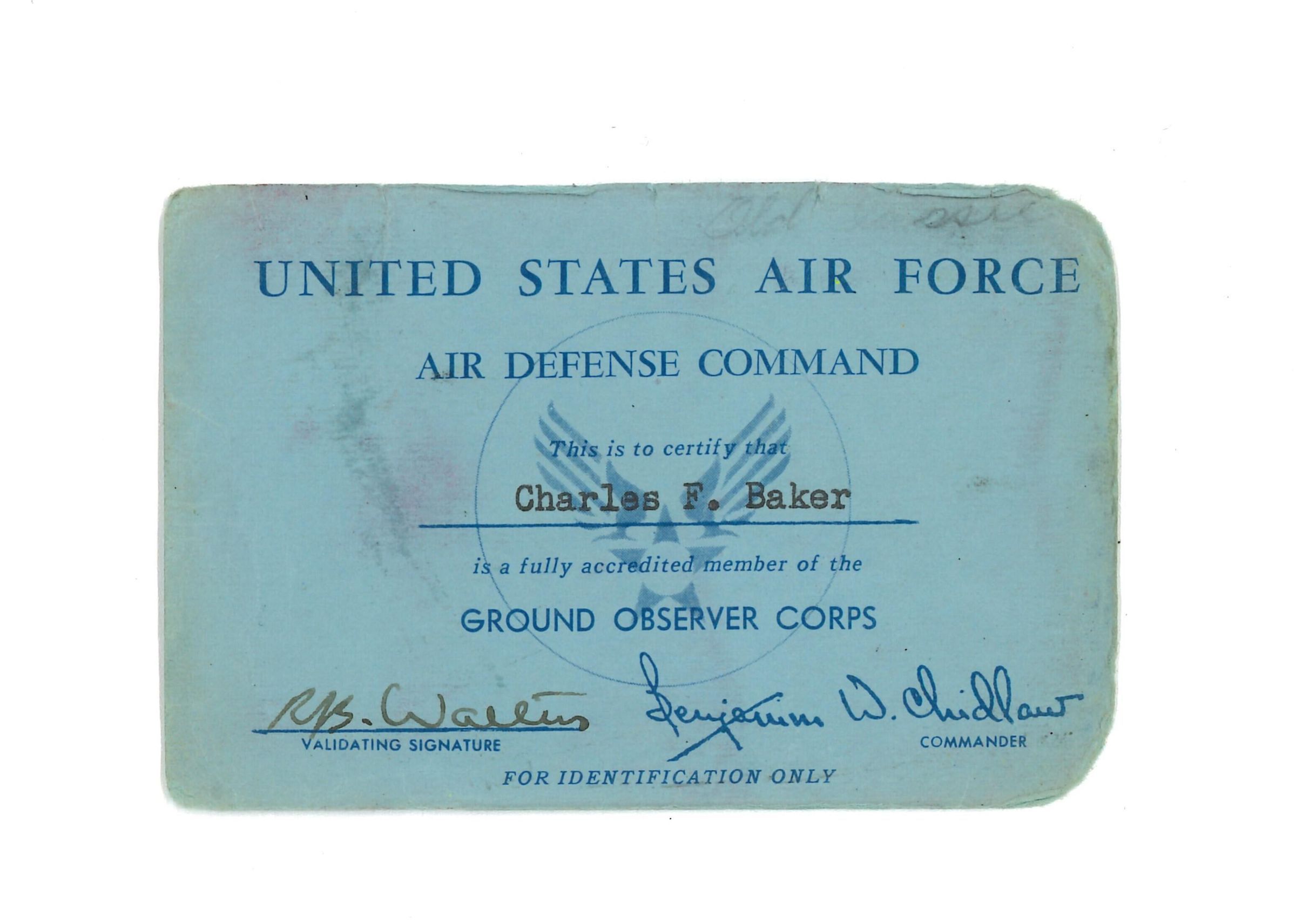 United States Air Force Air Defense Command. Charles F. Baker Is a fully accredited member of the Ground Observer CorpsAcquisition