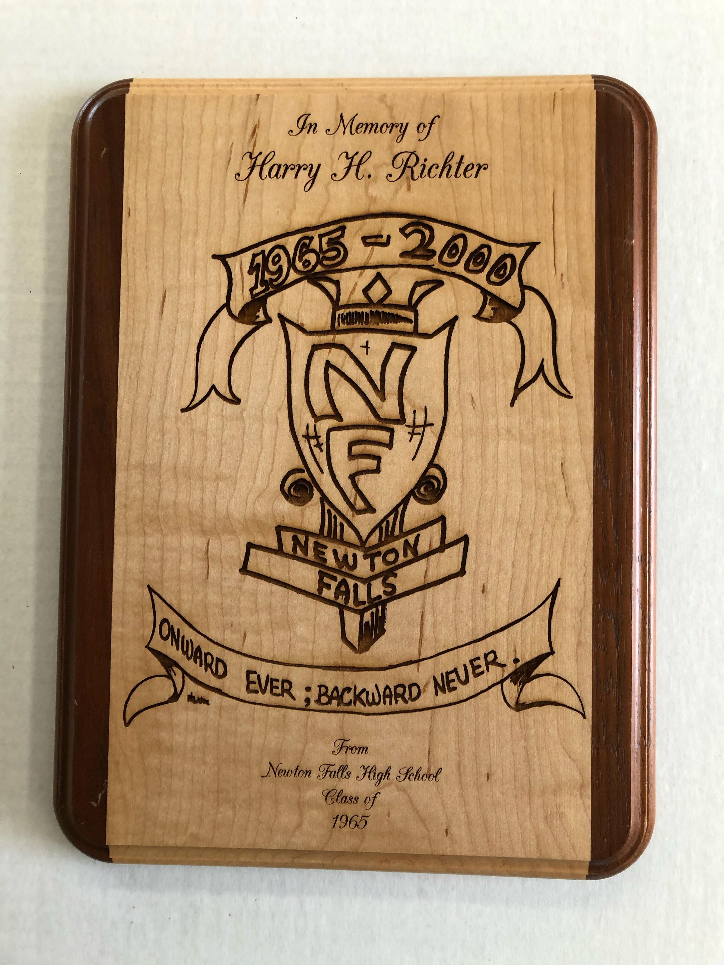 Memorial wood plaque for Harry H. Richter, 1965-2000 from the Newton Falls High School class of 1965.Acquisition