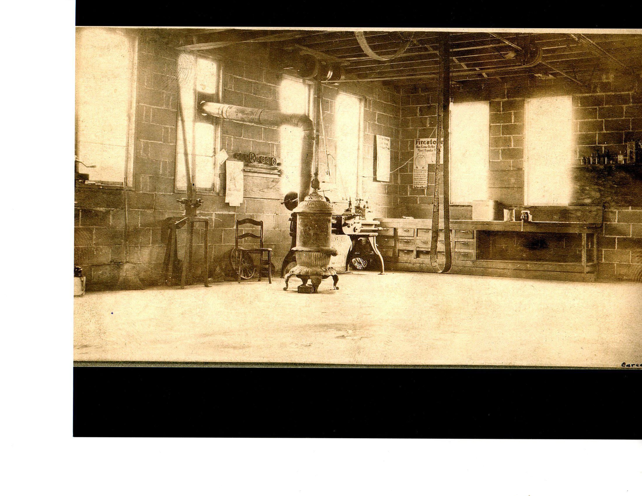 Interior of the 1908 garage of Bert E Meyers. This is the work area all machinery are driven by belt operated line shaft.Photograph Details