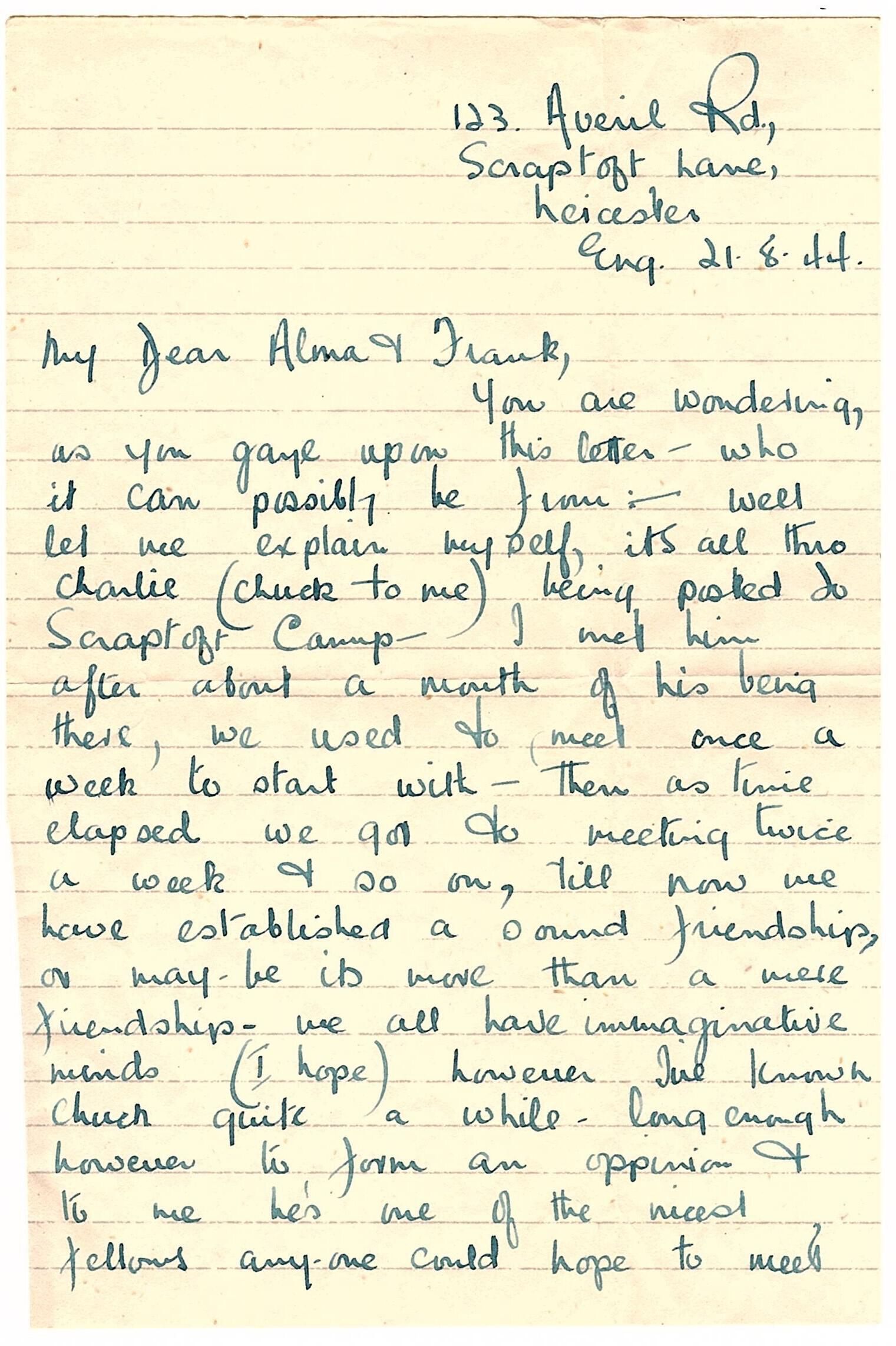 You are wondering, as you gaze upon this letter- who it can possible be from - well let me explain myself, its all thru Charlie (Chuck to me) being posted to Scraptoft Camp - I met him after about a month of his being there, we used to meed once a week to start with - Then as time elapsed we got to meeting twice a week & so on, till now we have established a sound friendship, or may-be its more than a mere friendship- we all have imaginative minds (I hope) however I’ve known Chuck quite a while long enough however to form an opinion & to me he’s one of the nicest fellows anyone could hope to meet. I’m going to miss him when he goes - yes I certainly am, I shall never forget when he went before – (for the invasion I mean) I thoroughly got accustomed to the idea that I had said Goodbye to him forever - anyway he got thru it all with flying colours & low & behold after 7 weeks, he was back at camp & we were having a beer together.