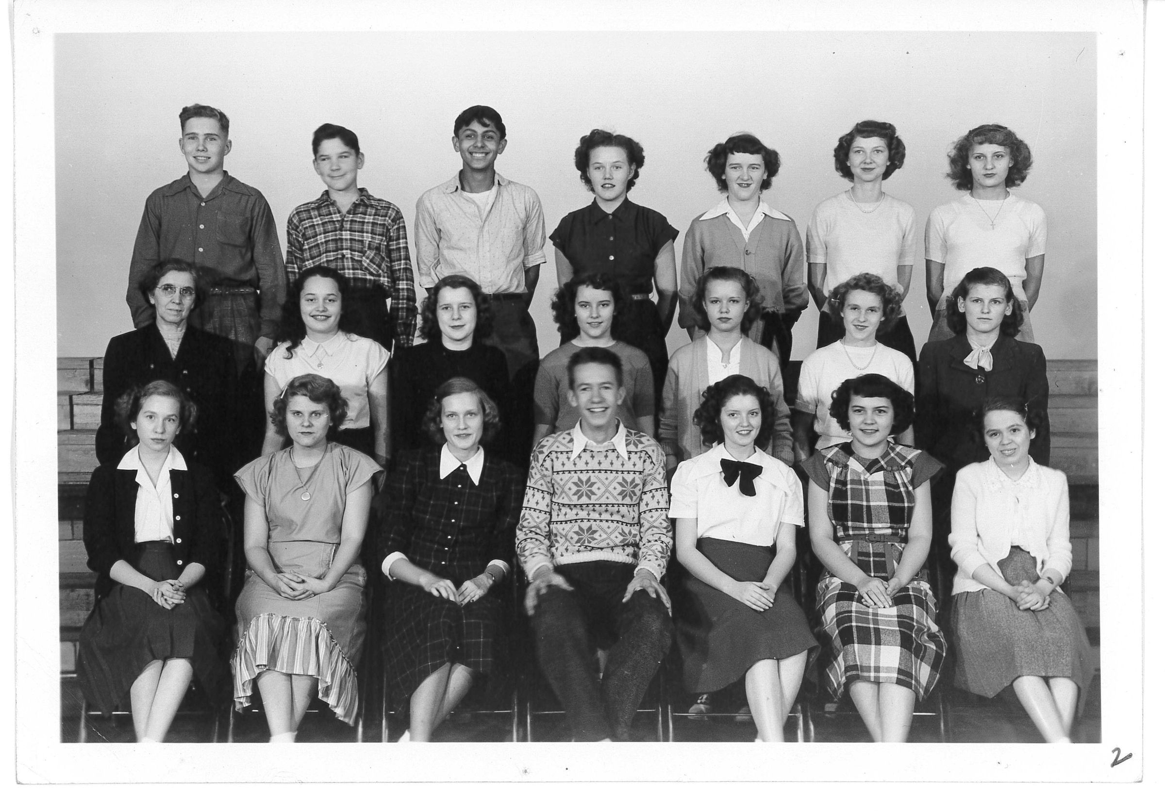 Latin Club II, 1948-1949. Left to right. Bottom row: Patricia McIntosh, Nancy Comstock, Marilyn Cain, Max Mattes, Betty Booher, Wilma Gordon, Ann Singer. Row 2: Ann Lewis (advisor), Marlene Rogos, Holbrook, Carol Sue Grissom, Clara Surick, Jeanne Allen, Betty Ann Schilling. Top row: Robert Whitacre, Murray Hallett, Robert Maxino, B. Adams, Virginia McCabe, Eileen Kilroy, Eleanor Horvath.Photograph Details