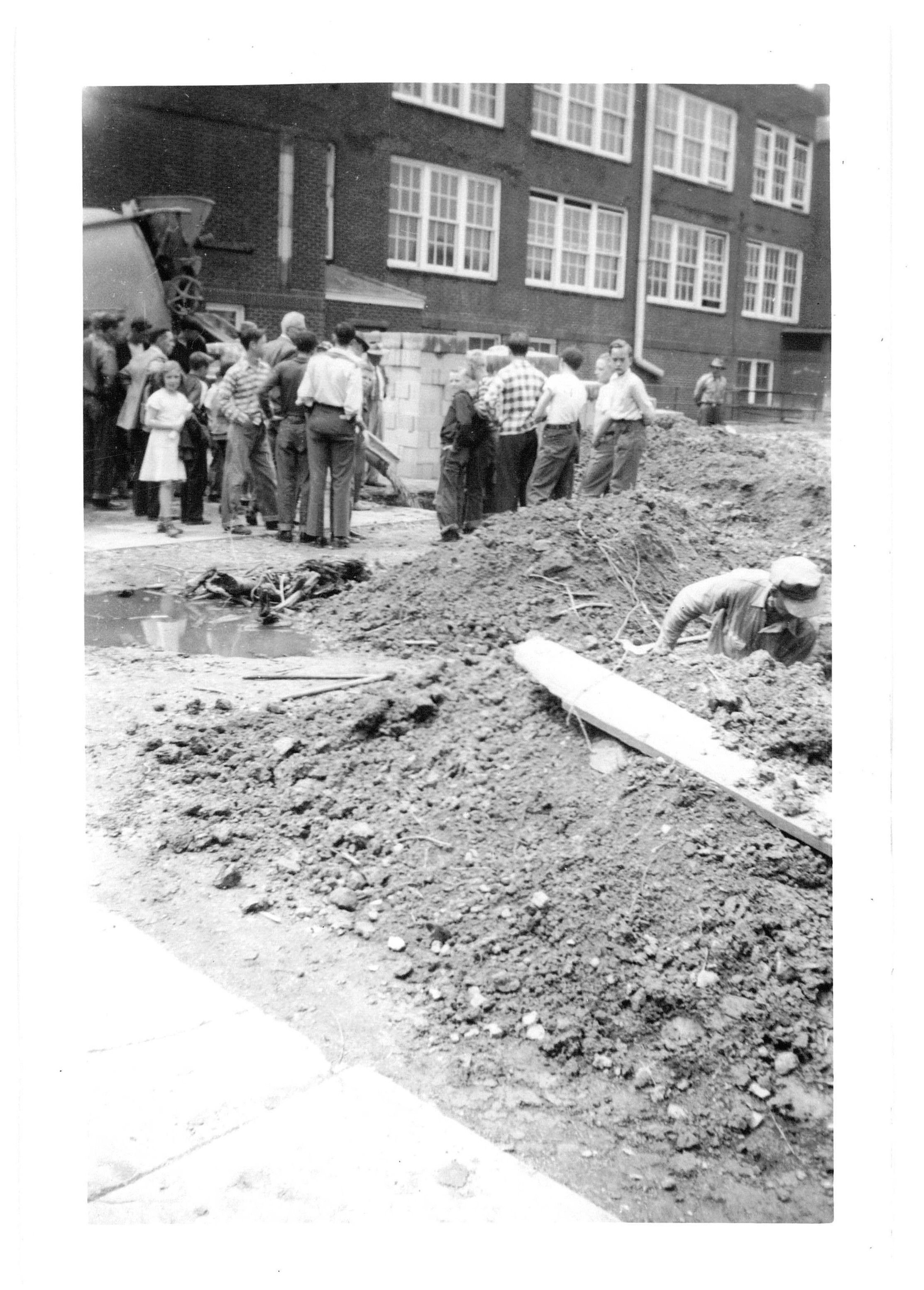Students gathered around the new library construction site as concrete is being poured.Photograph Details
