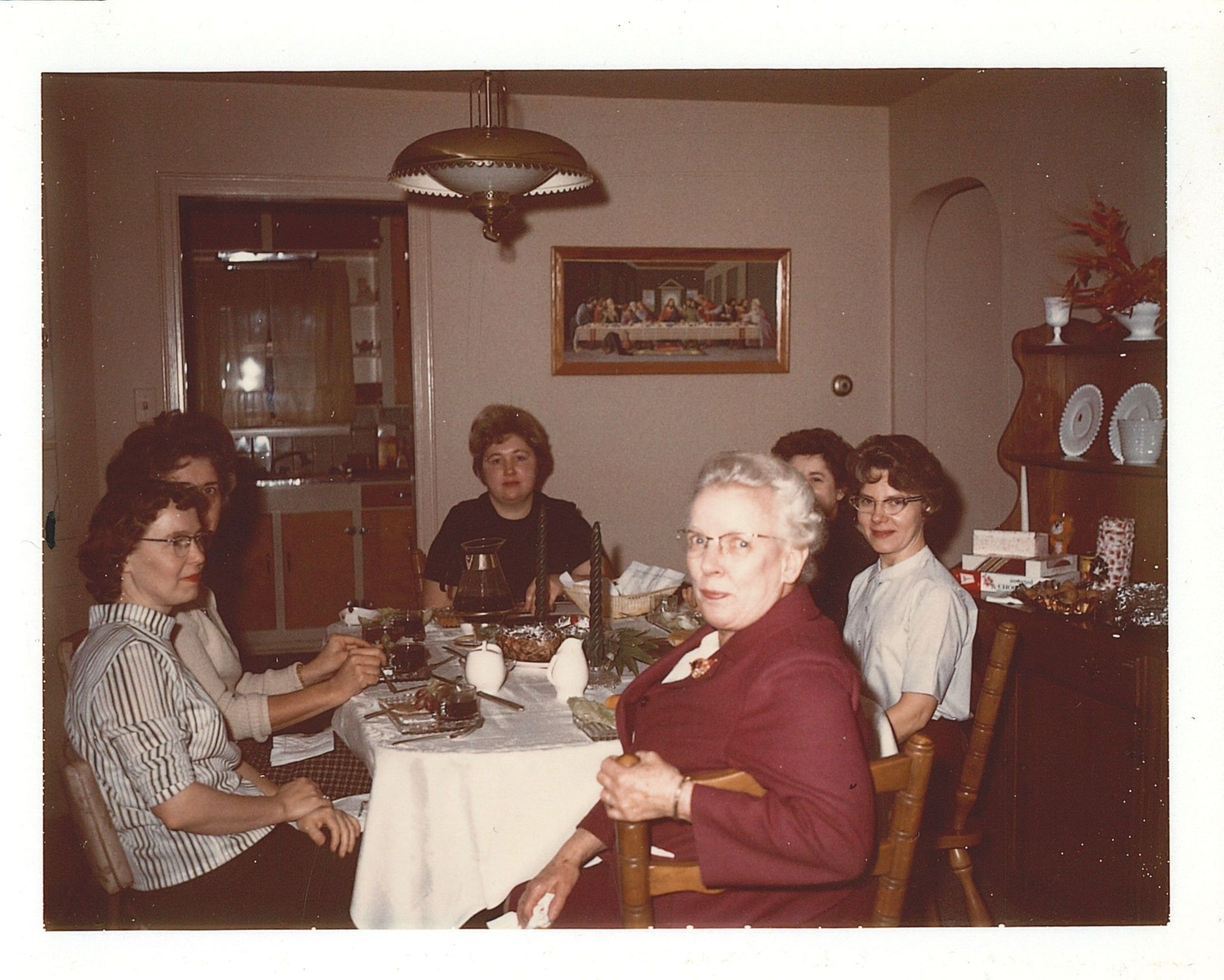 Christmas gathering of library staff and clerk treasurer at home of Bea Lamport, 20 West Fifth St., Newton Falls c. December 1964. Clockwise from left: Donnabella Collins, Louise Hirsch, Georgene Debolt, Ann Coach, Ruth Sharec, Helene Catherman. Bea Lamport was the photographerPhotograph Details