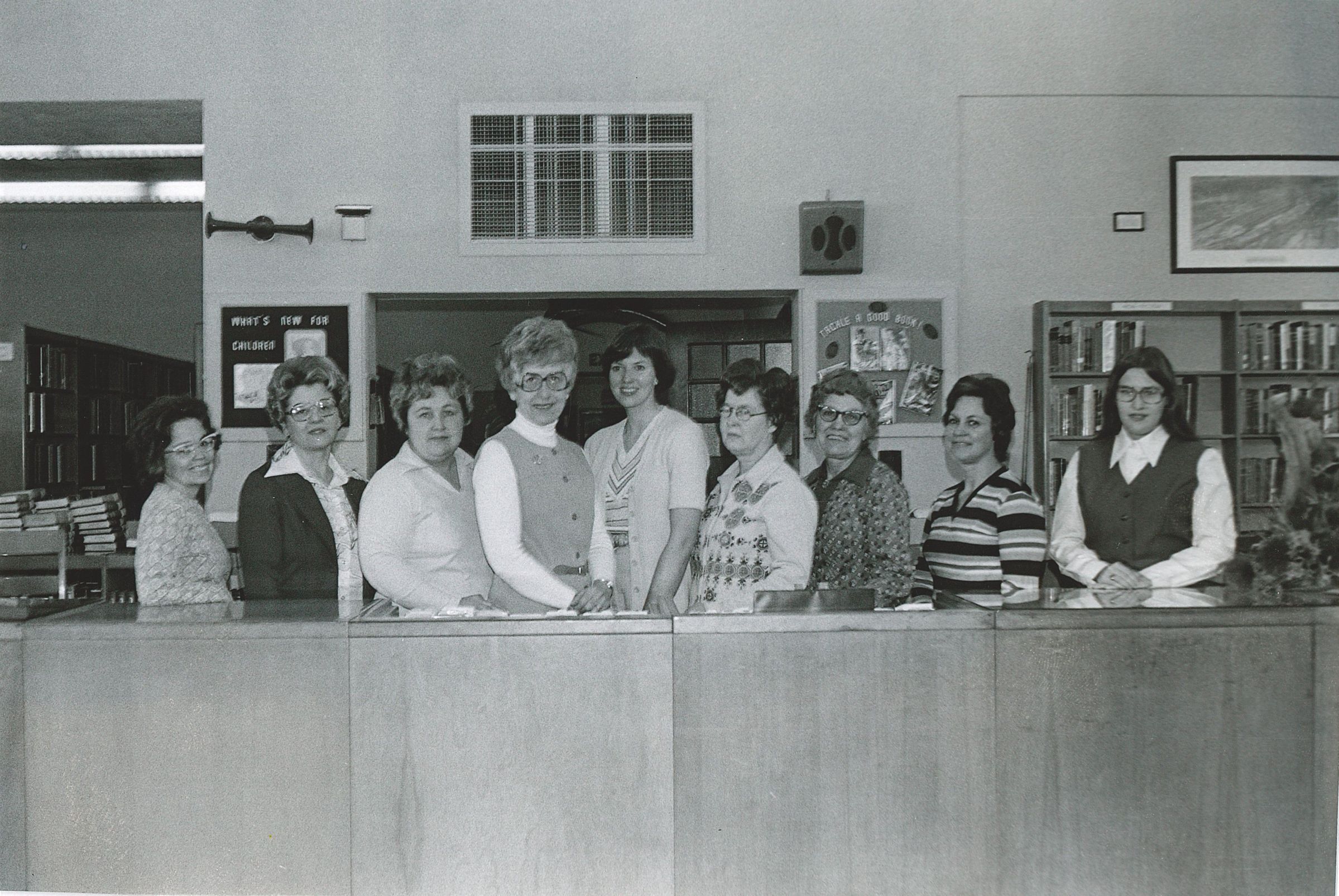 Library Staff: L-R Ann Luketic, Betty Stempak, Georgine DeBolt, Louise Hirsch, Carol Crosby Baker, Donnabelle Collins, Elizabeth Swigger, Ann Cariglio, Colleen Gibbons.Photograph Details