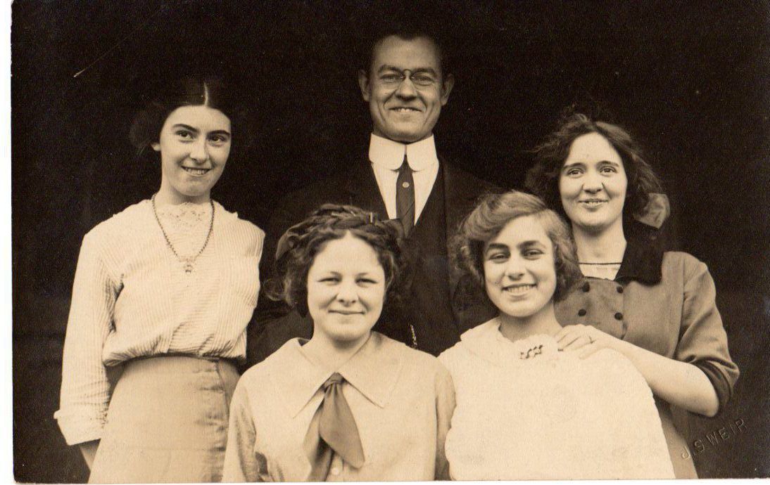 "Mischief Committee", Members of the Class of 1917. L-R: Bess Harnar, Frances Taylor, Helen White, Lena Weiss, Teacher Clifford F Rall.Photograph Details