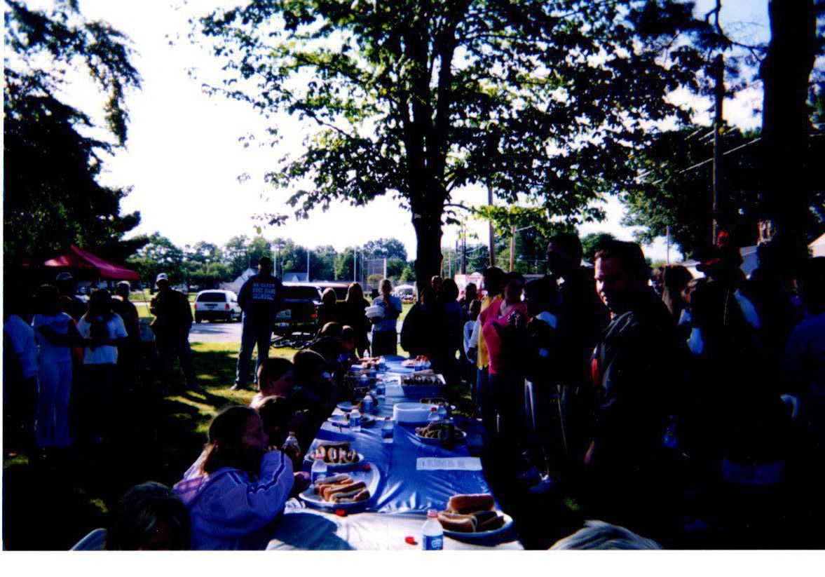 Adults step up to the challenge in the hot dog eating contest. Winner receives a slab of BBQ ribs.Photograph Details