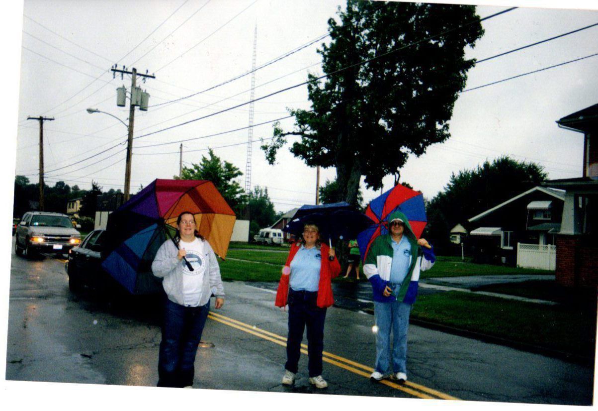 Posing in the rain during parade time is Sara Davidson, co chairmen of the NFBC, Diana Shiley, committee member and Rick Schaffer.Photograph Details