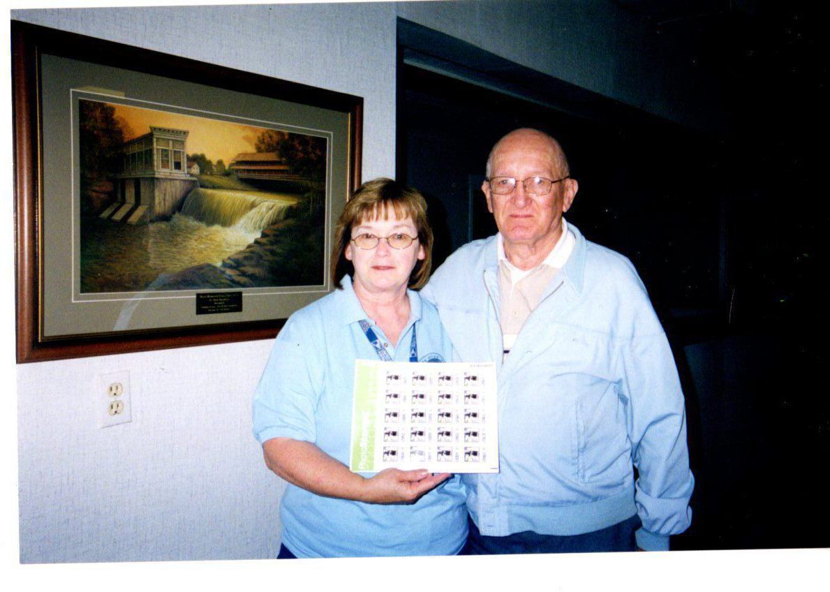 Tyra Thompson, Post Master of Newton Falls sells a set of stamps in honor of the Bicentennial to retired postmaster, Steve Namesmick of Newton Falls. They are standing inside the Community Center.Photograph Details