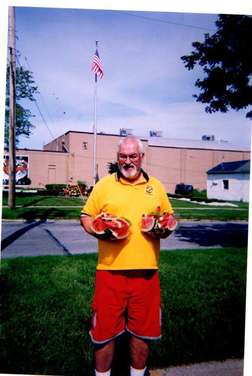 Barry Silliphant handing out watermelon after the Kiwanis Labor Day Bicentennial Race. The club raised $4,500.Photograph Details
