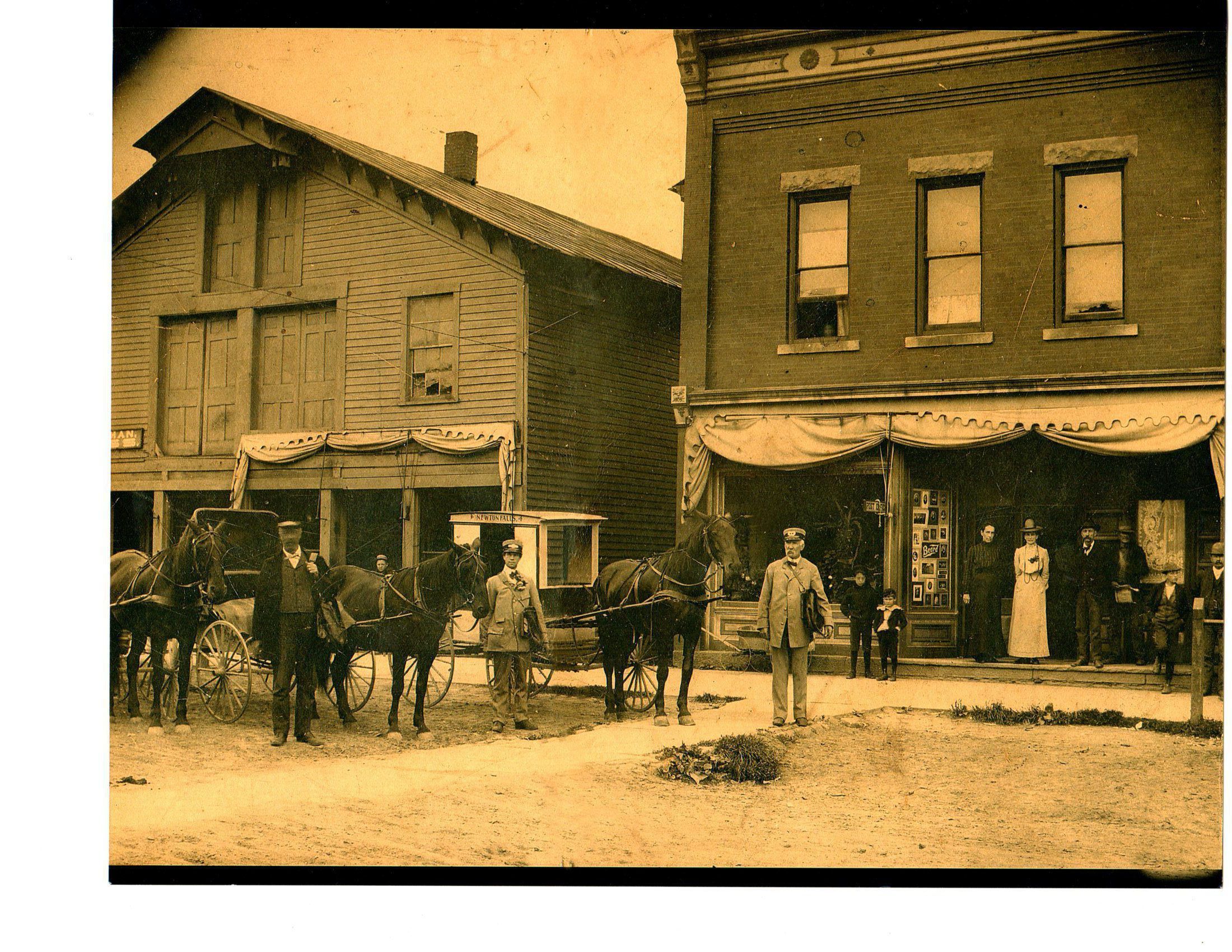 Post office was in building which once housed the Herald, is now Rocky's Barber Shop on Broad St. There were 3 routes for mail delivery. From left to right is Ben Lovett-Route 3 Pete Lawrence-Route 2 and Cooke Hudson-Route 1. in front of the building is Grace Fenton (dark dress) and Julia Keyes and Charles Fenton (Post Masters) the young children on the porch are Ray Fenton and Henry Goeppinger.Photograph Details