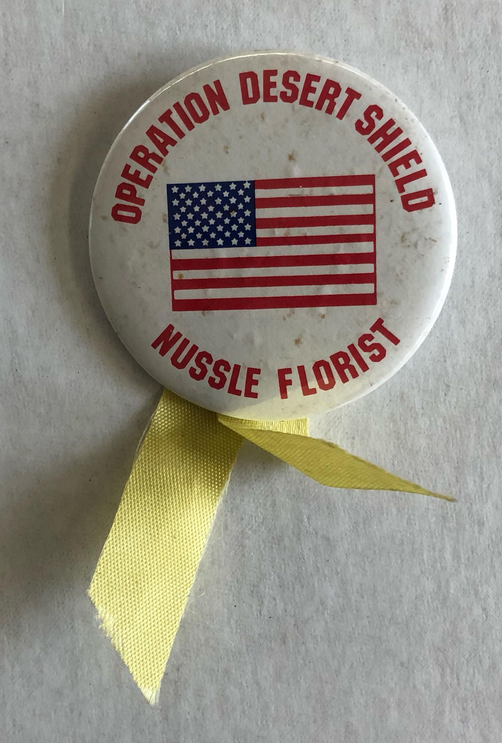 Nussle Florist Operation Desert Shield pin with yellow ribbon on bottom. Pin is potentially in remembrance of Operation Desert Shield (August 1990 - January 1991). Pin is undatedDimensions