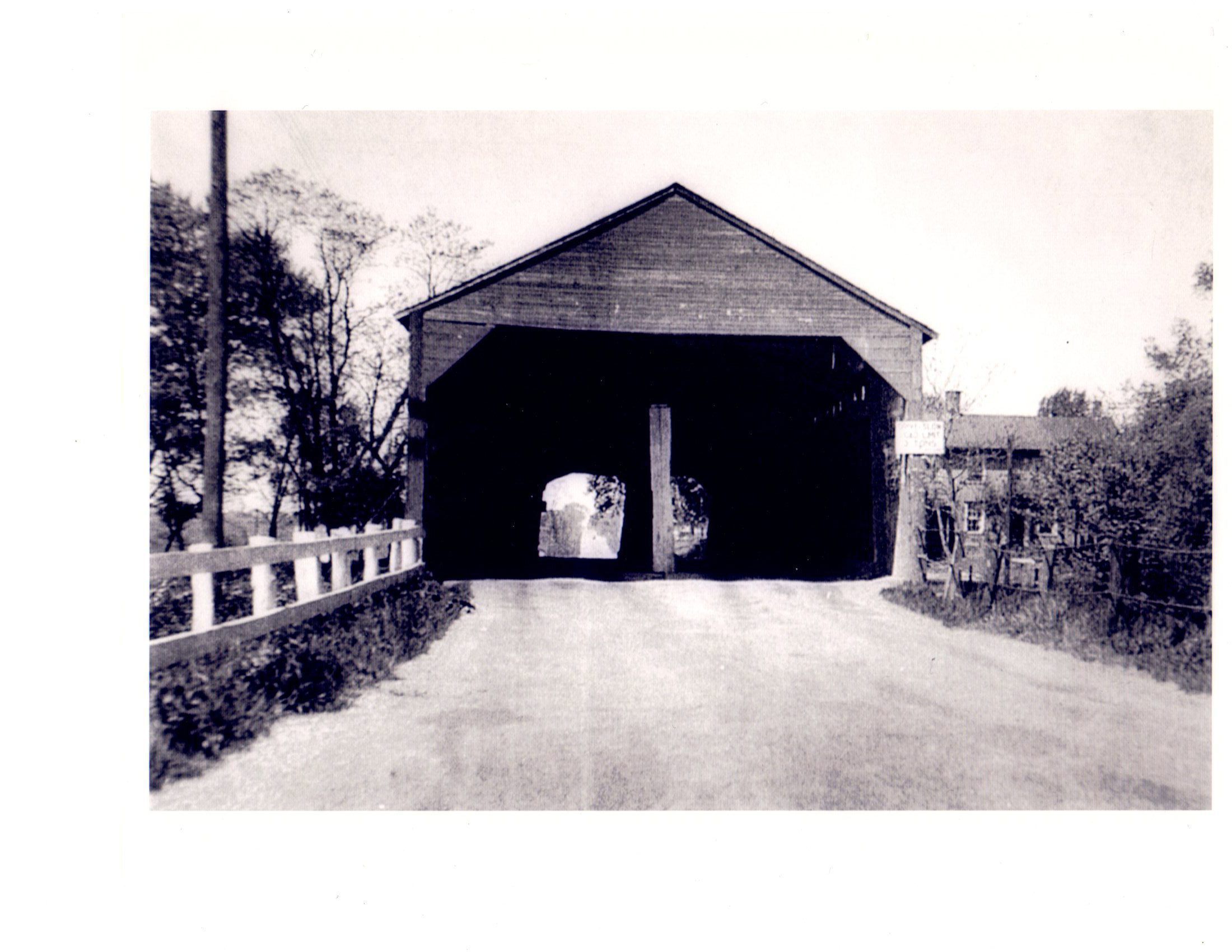 The double two lane covered bridge over the east branch of the Mahoning River in Pricetown. View from the west looking east. House on the right was Callendar home, later Larry Lingo's home. Mrs. Callendar was Judge Price's daughter. It was located on corner of County Line Road and North Pricetown Road.Photograph Details