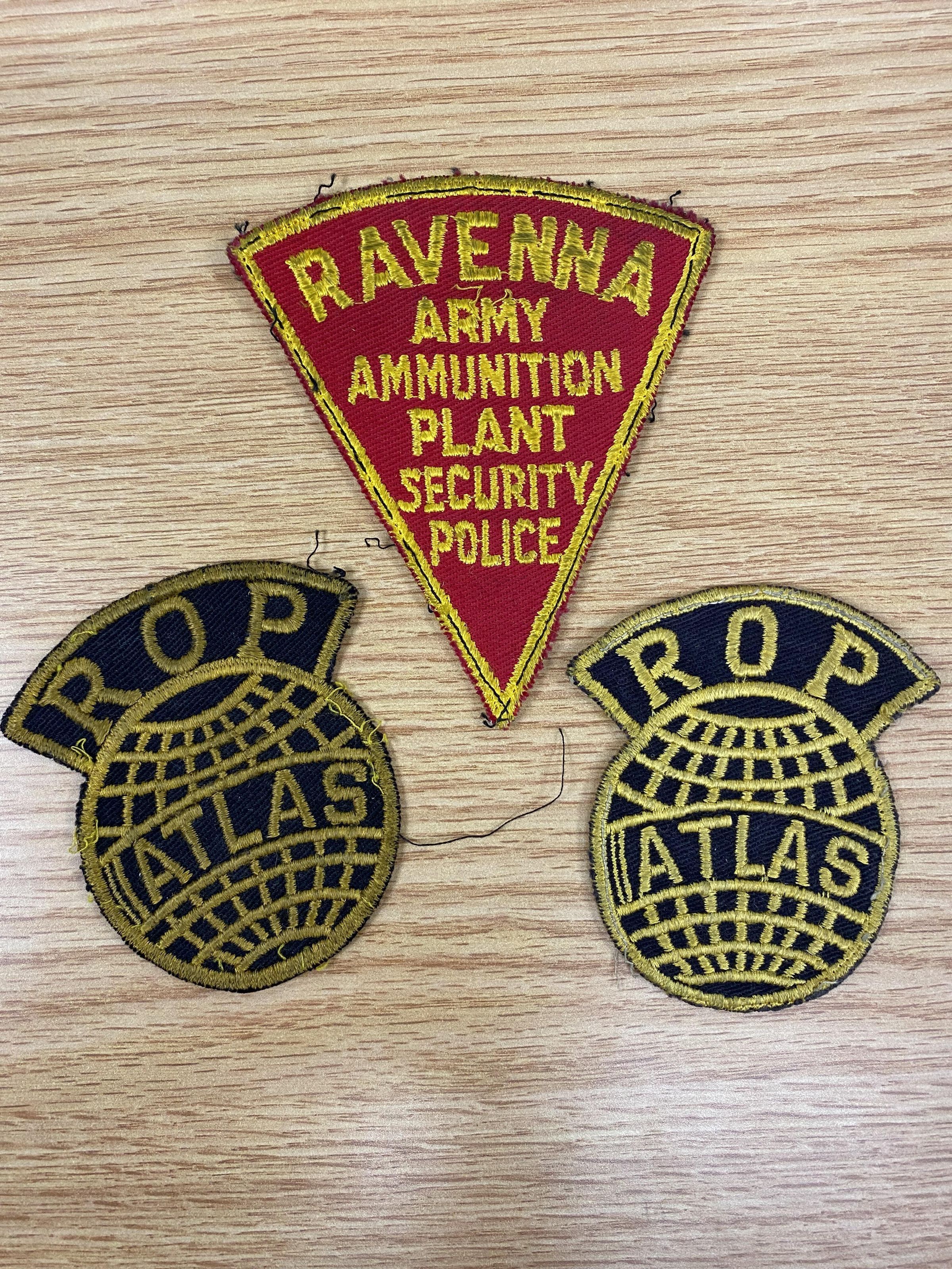Two ROP Atlas badges and one Ravenna Army Ammunition Plant Security Police badges