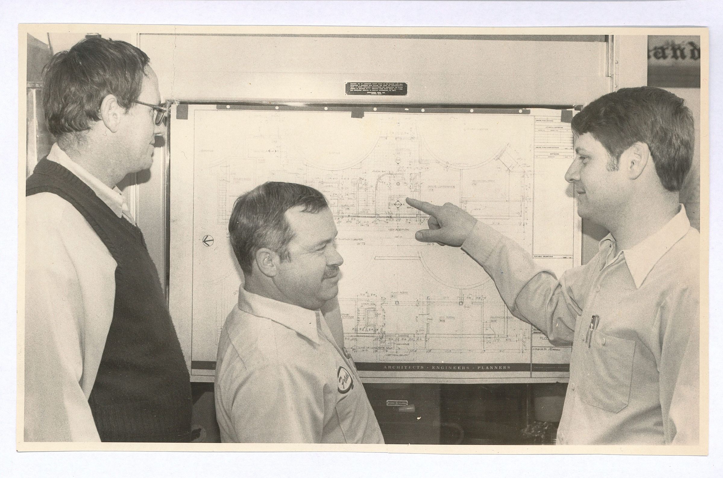 Dennis Kirkland (right), supervisor and chief operator at the Wastewater Treatment Plant, goes over plans for the new addition with operators Don Lawrence (left) and Frank Singer (center).Photograph Details