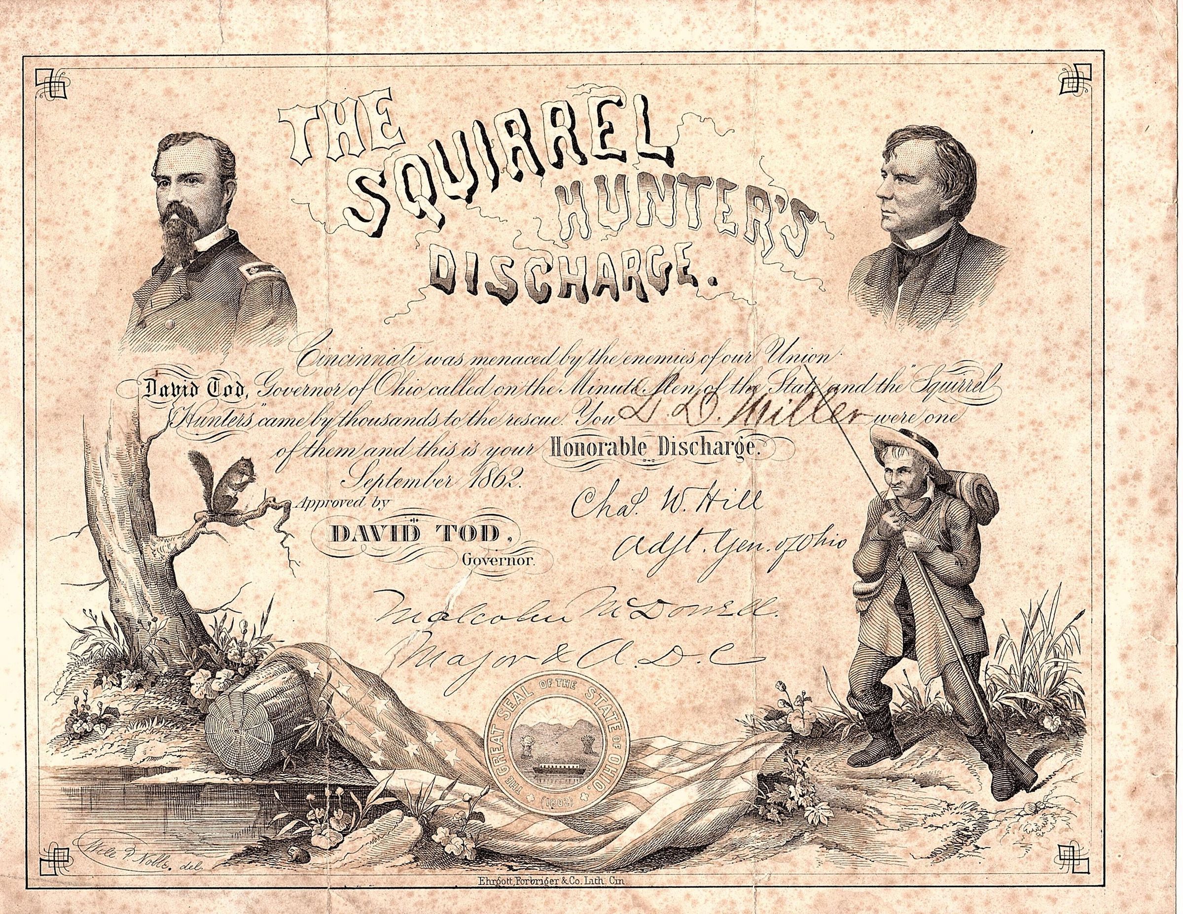 The Squirrel Hunter's Discharge. Cincinnati was menaced by the enemies of our Union David Tod, Governor of Ohio called on the Minute Men of the State and the "Squirrel Hunters" came by the thousands to the rescue. You L.D. Miller were one of them and this is your Honorable Discharge. September 1862. Approved by David Tod. Chas. W. Hill Adjt. Gen. of Ohio Malcolm McDowell Major & A.D.C.Language