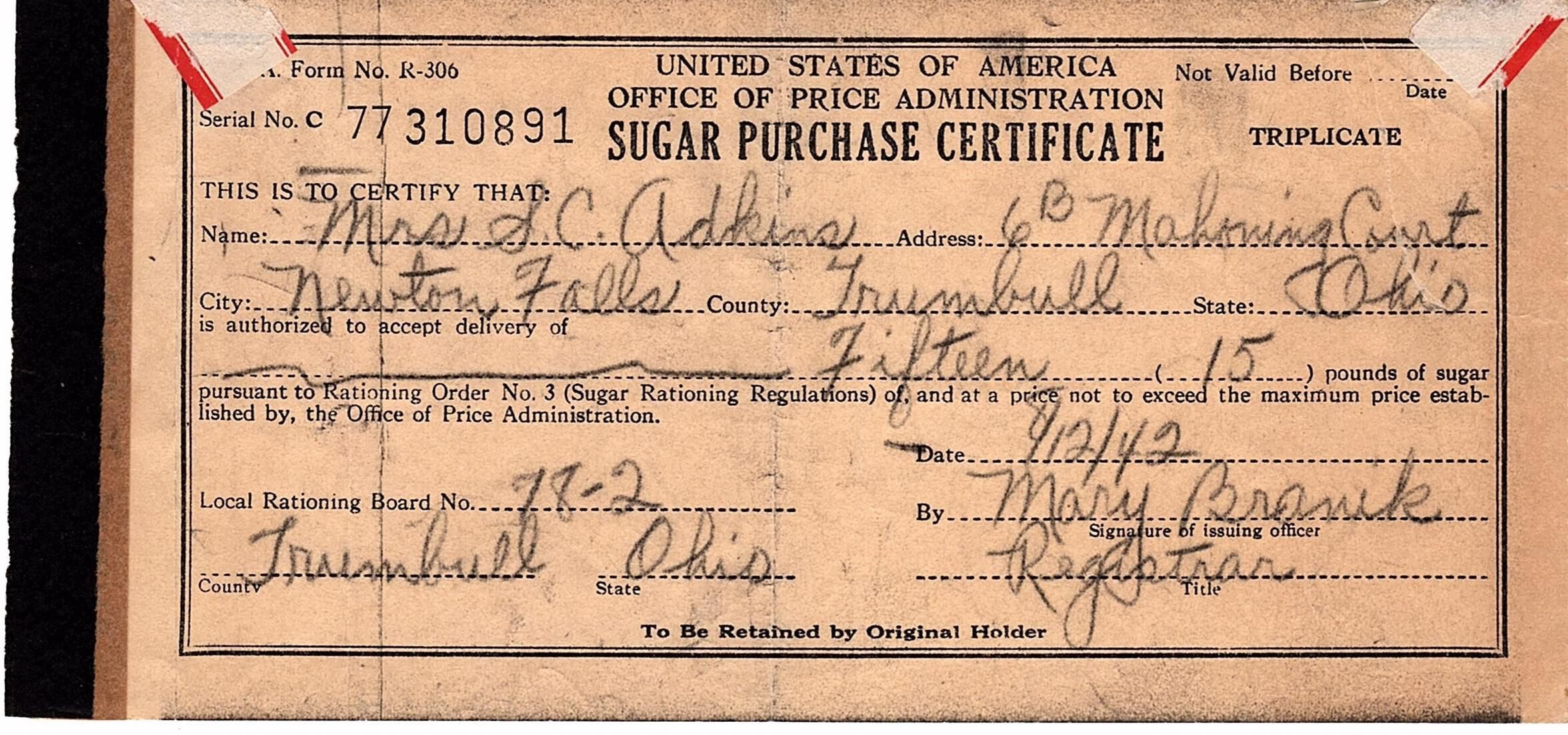 Sugar purchase certificate for 15 pounds of sugar issued to Mrs. S. C. Adkins on September 12, 1942 and envelope.Acquisition