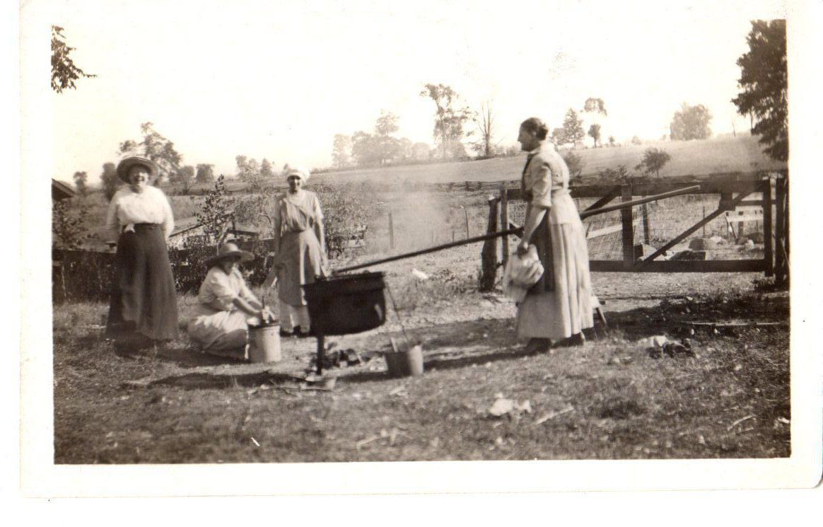 The woman are making apple butter. The women to the far right is Aurlda Flohr, the other three woman are unknown.Photograph Details