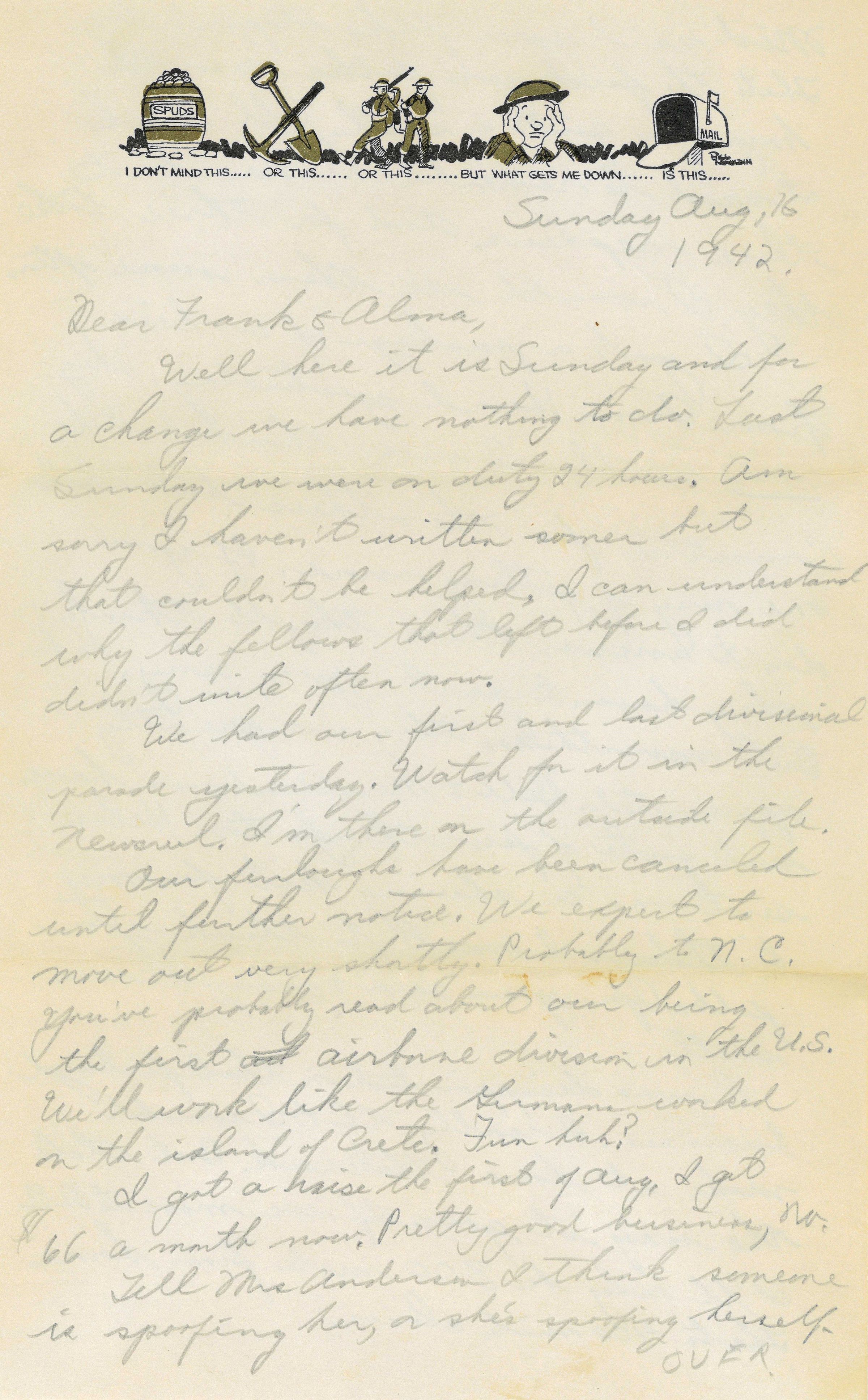 Our furloughs have been canceled until further notice. We expect to move out very shortly. Probably to N.C. You've probably read about our being the first airborne division in the U.S. We'll work like the Germans worked on the island of Crete. Fun huh?