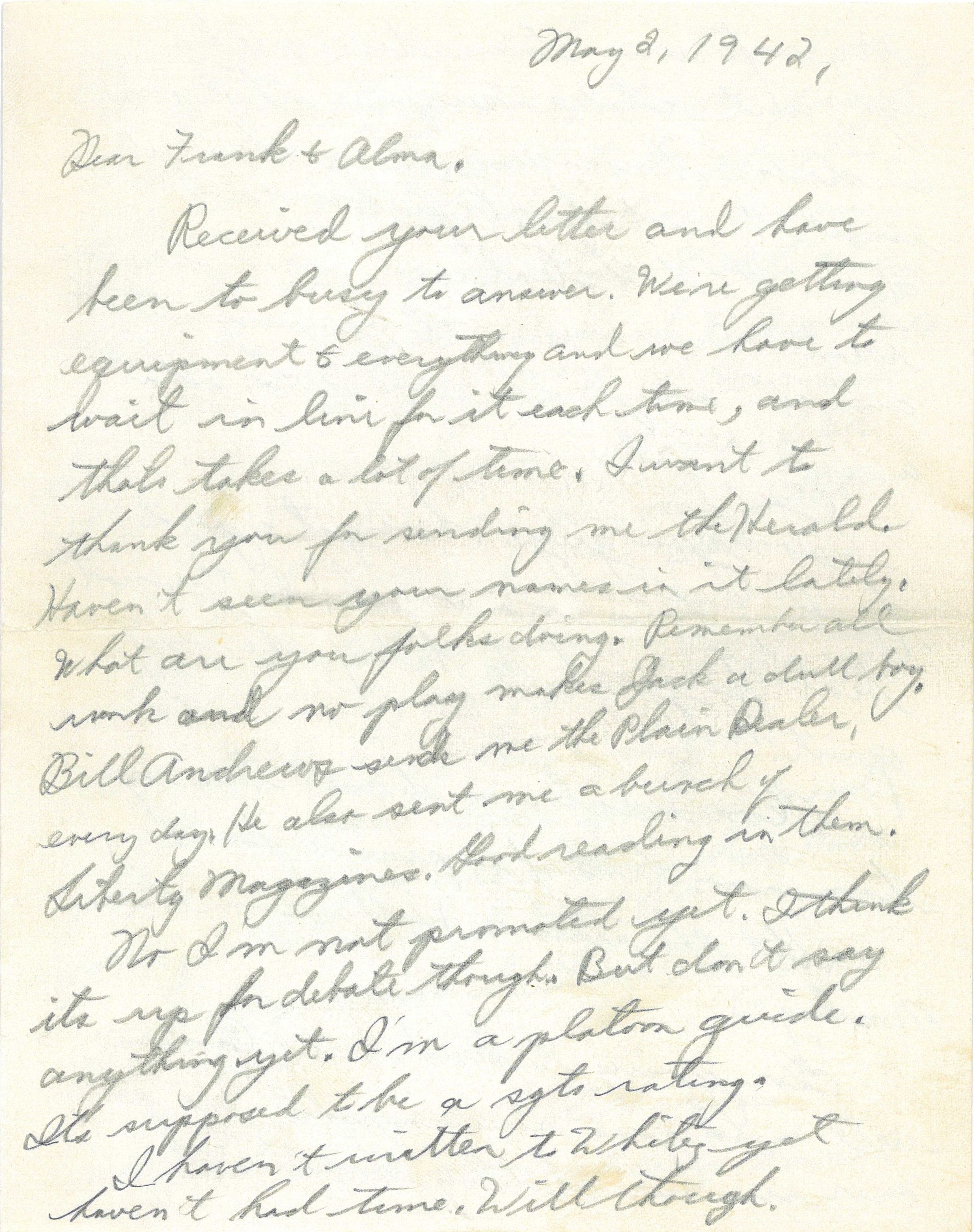 Received your letter and have been to busy to answer. We're getting equipment & everything and we have to wait in line for it each time, and that takes a lot of time. I want to thank you for sending me the Herald. Haven't seen your names in it lately. What are you folks doing. Remember all work and no play make Jack a dull boy. Bill Andrews sends me the Plain Dealer, every day. He also sent me a bunch of Liberty Magazine. Good reading in them.