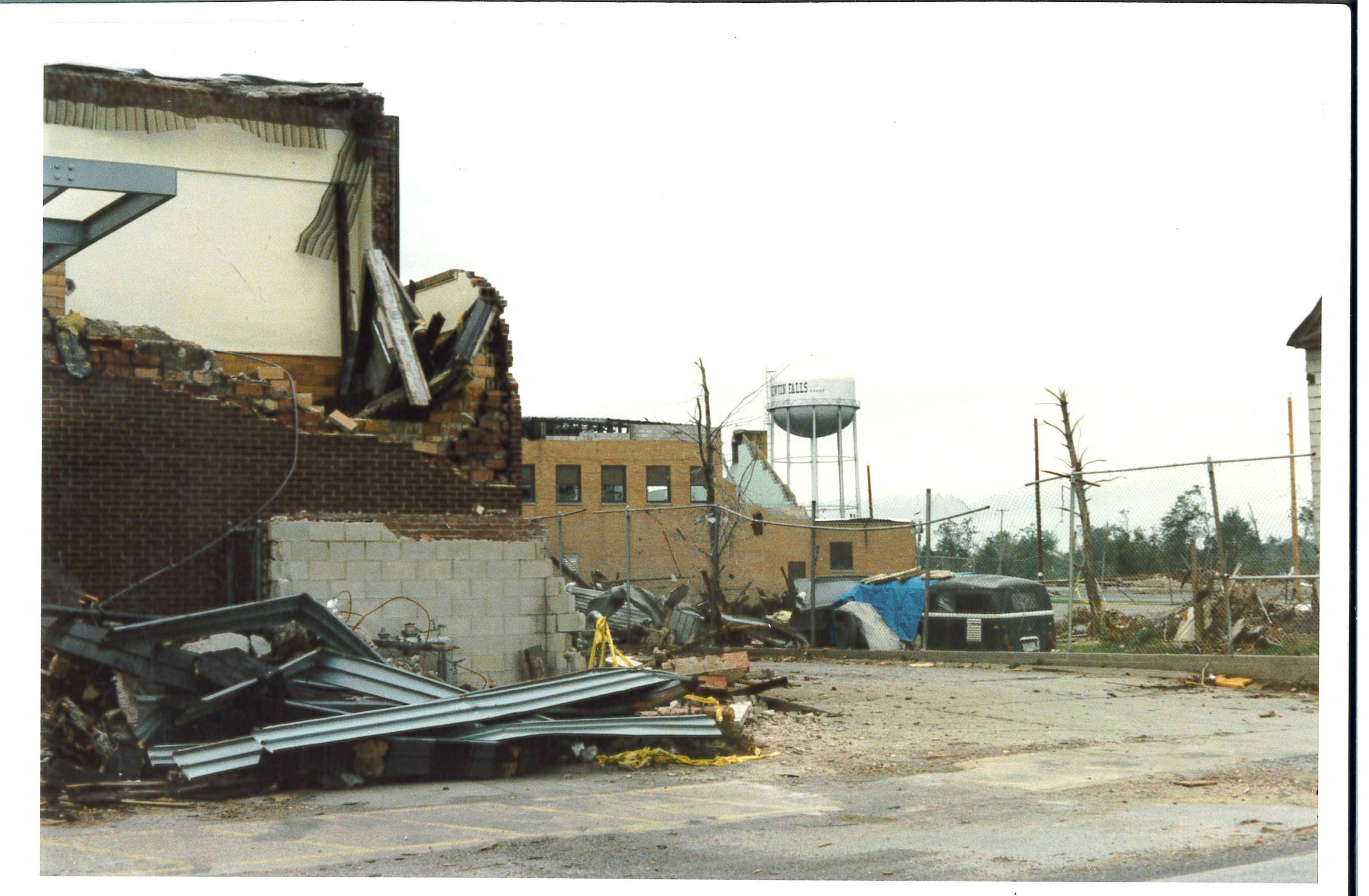 View from Jay Street looking south west toward the water tower. Pictured on left is the damaged Newton Falls Jr. High School and center is the damages Newton Falls High School GymPhotograph Details