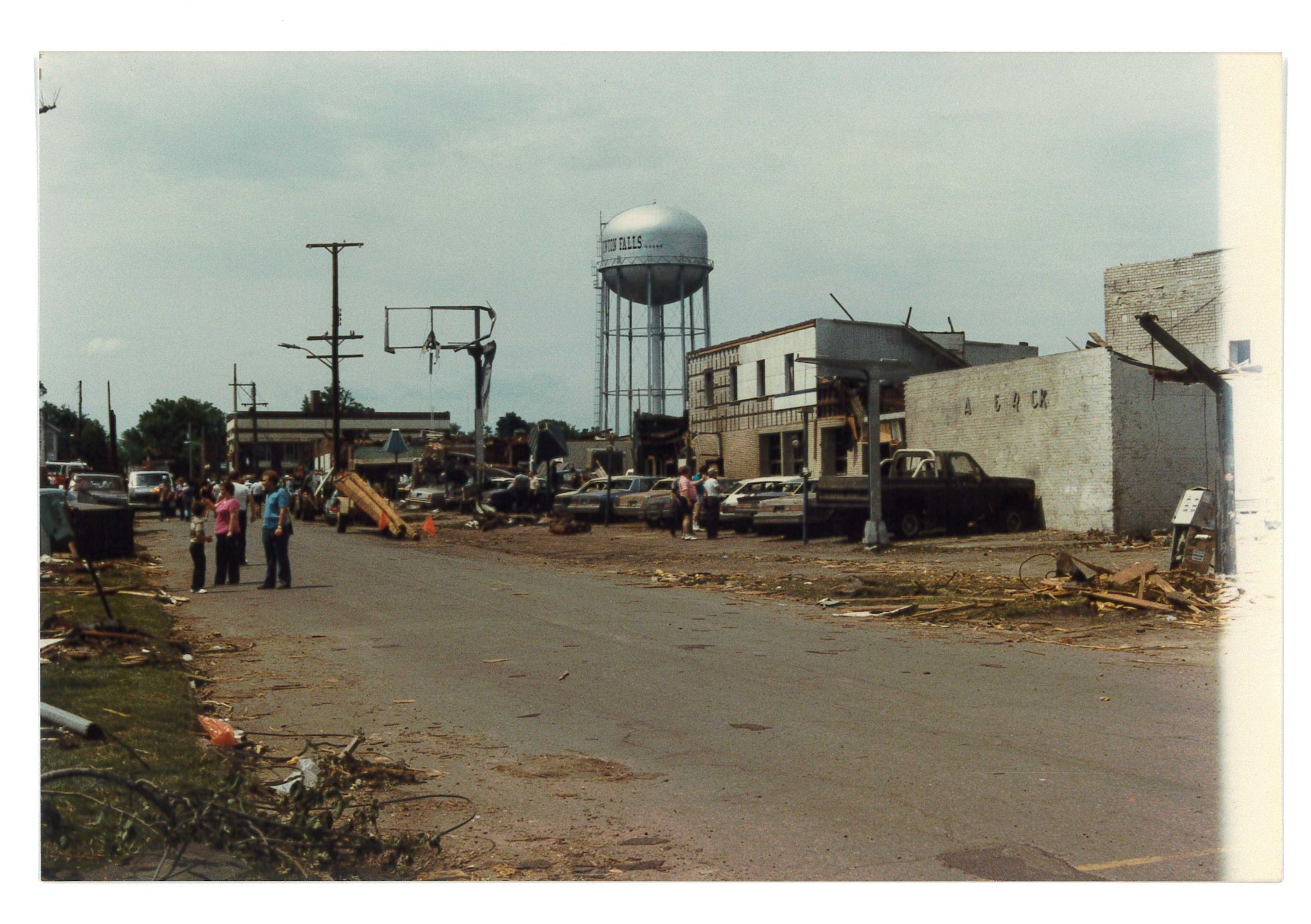 May 31, 1985 Tornado damage on North Canal Street. Bumbu Ford Dealership and Post Office/Newton Falls Plaza in the distance. Water tower is also seen.Photograph Details