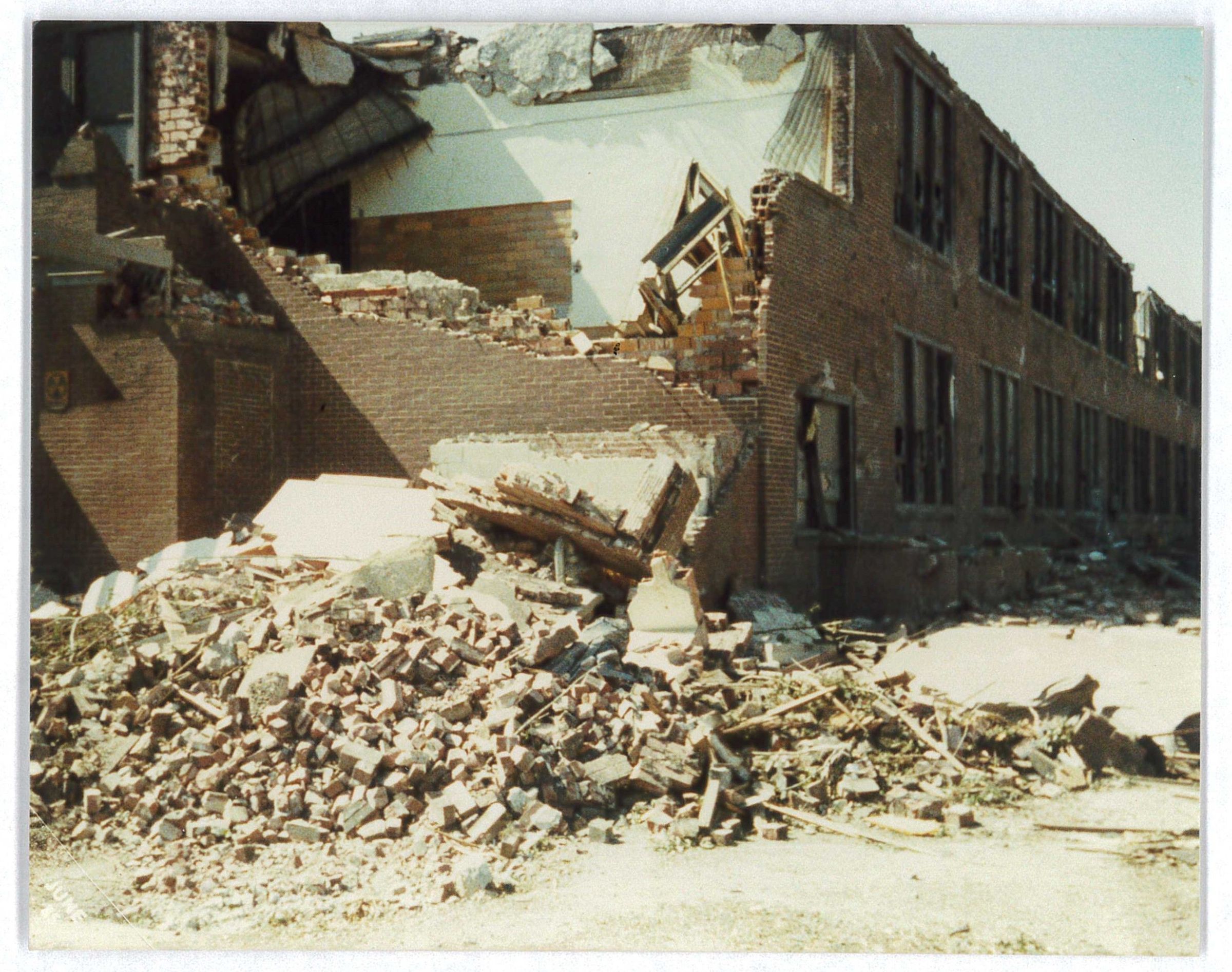 Damage done to the Jr. High School. Photo taken on Jay Street.Collection
