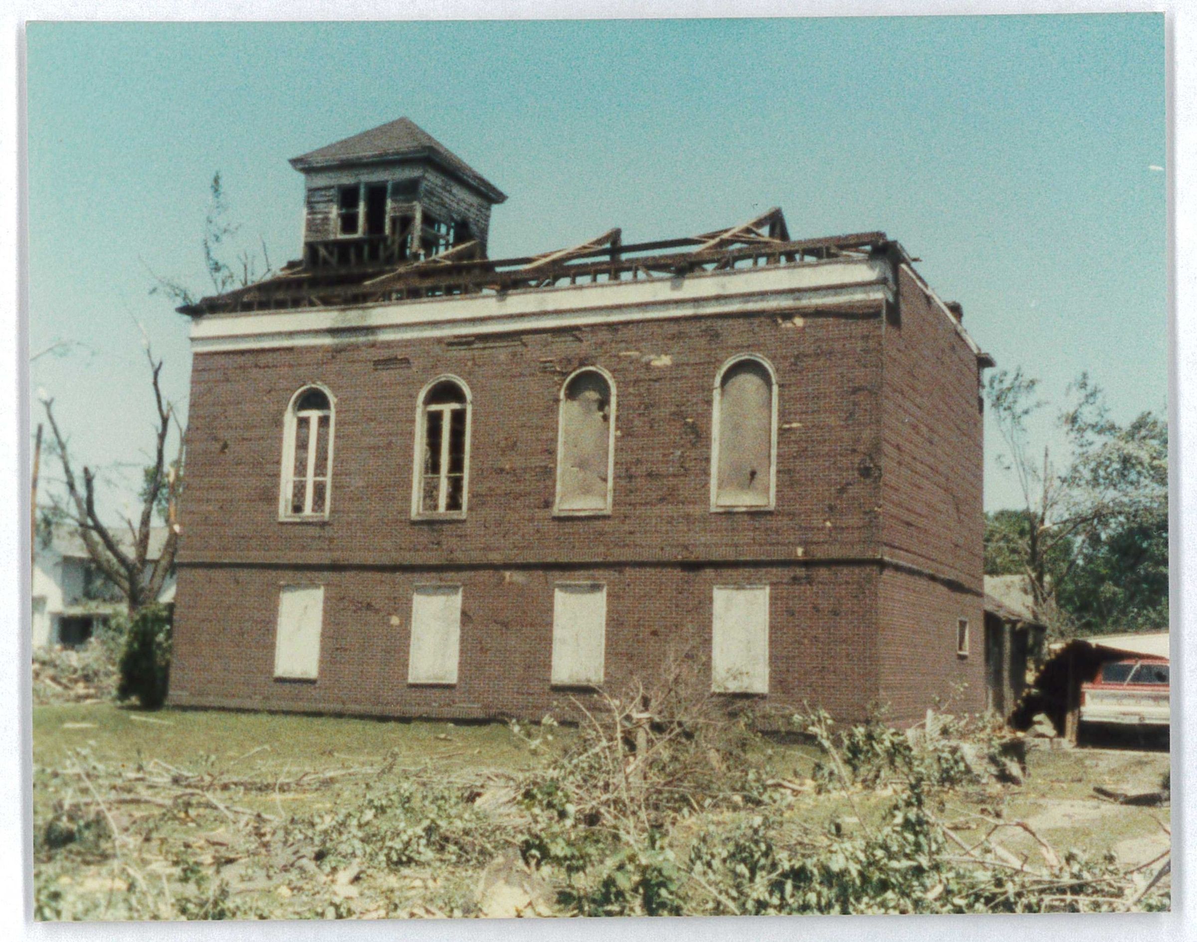 Tornado damage done to Sister of Pythian Hall on the corner of Center and Jay Street.Photograph Details
