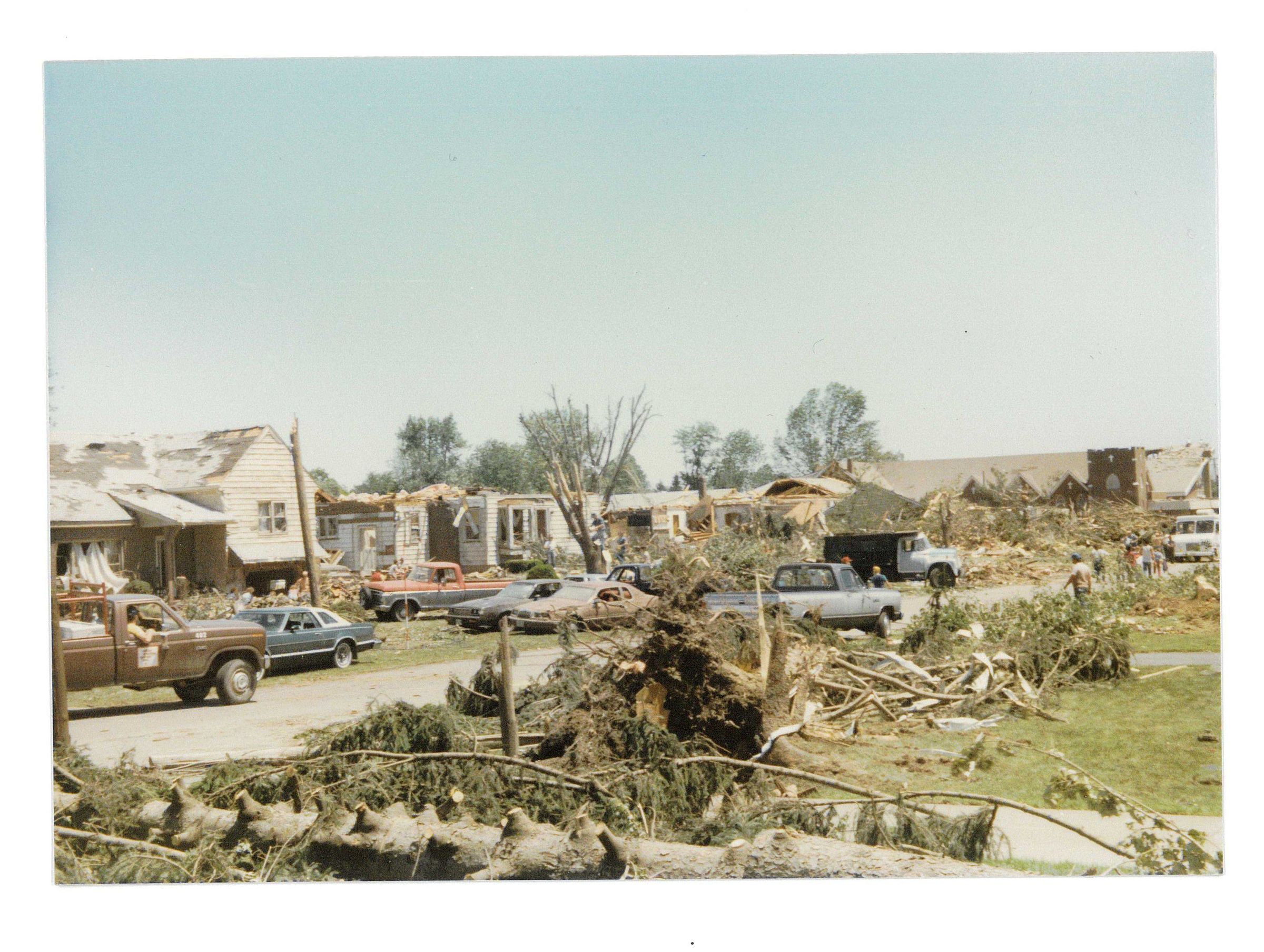 Homes and trees on Charleston Road destroyed by the tornado. First Church of God seen in the distance.Photograph Details