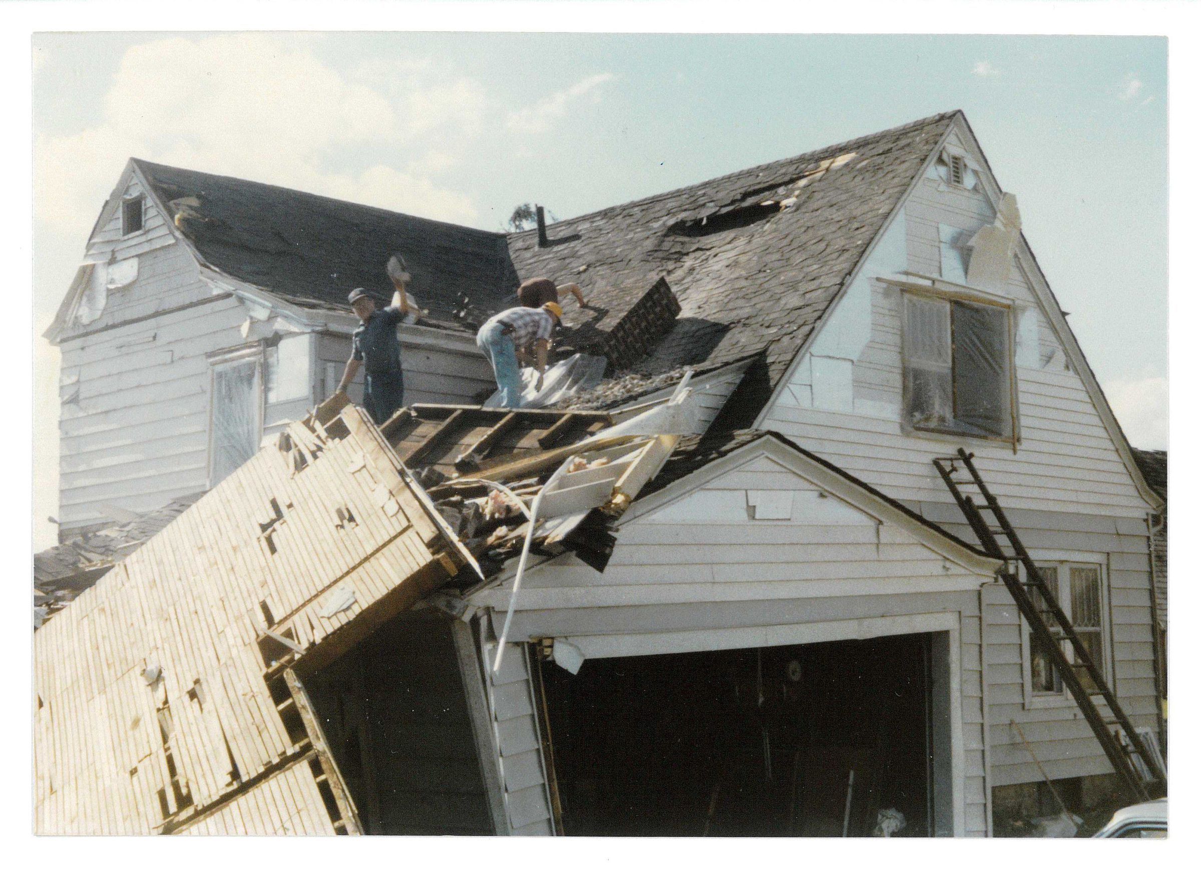 Unknown workers on the roof cleaning away debris from the tornado, Charlestown RoadCollection
