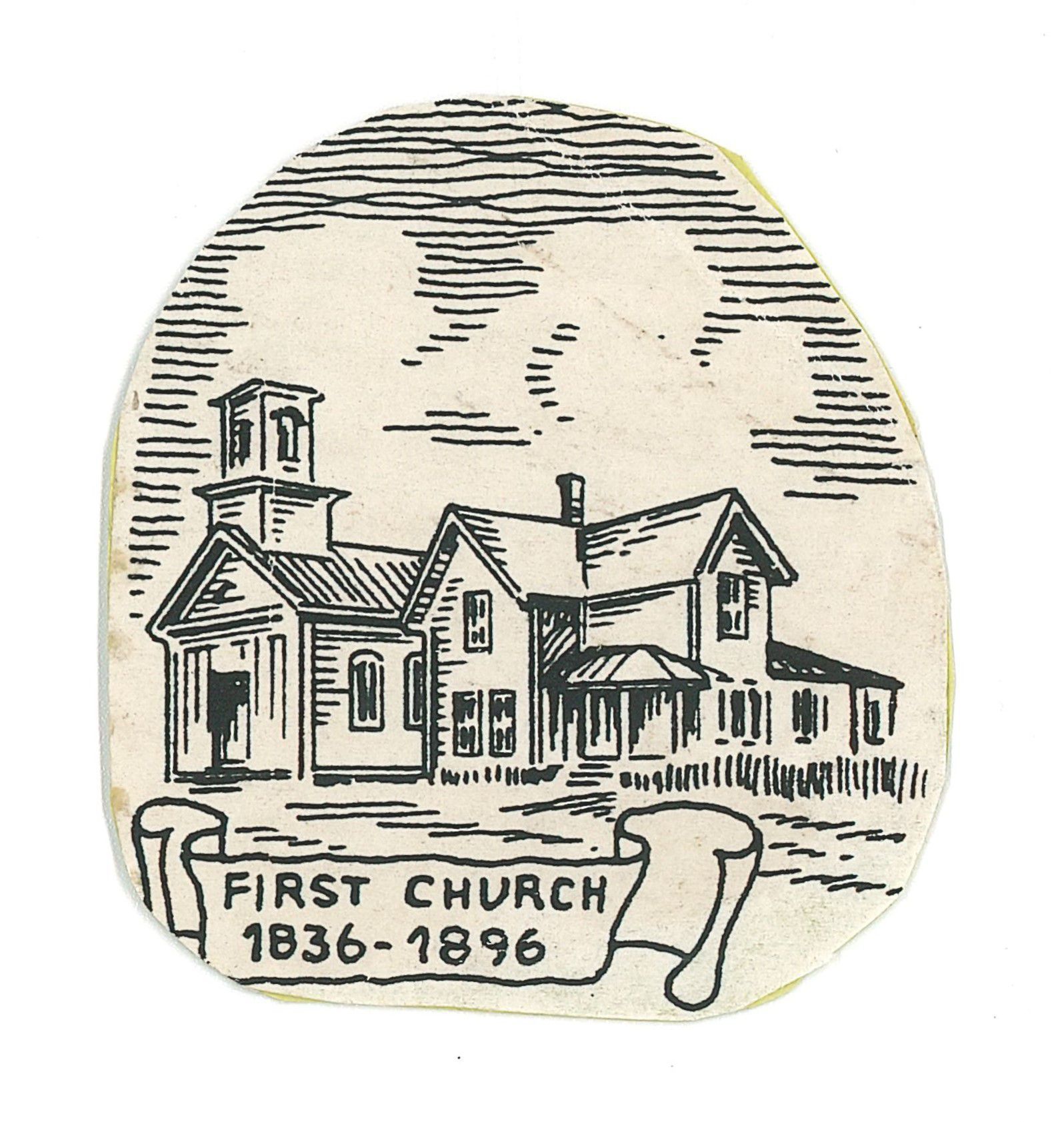 Cut-out ink drawing of the first Methodist Church on the North side of Olive Street, from the year long sesqui-centennial.Type of Drawing