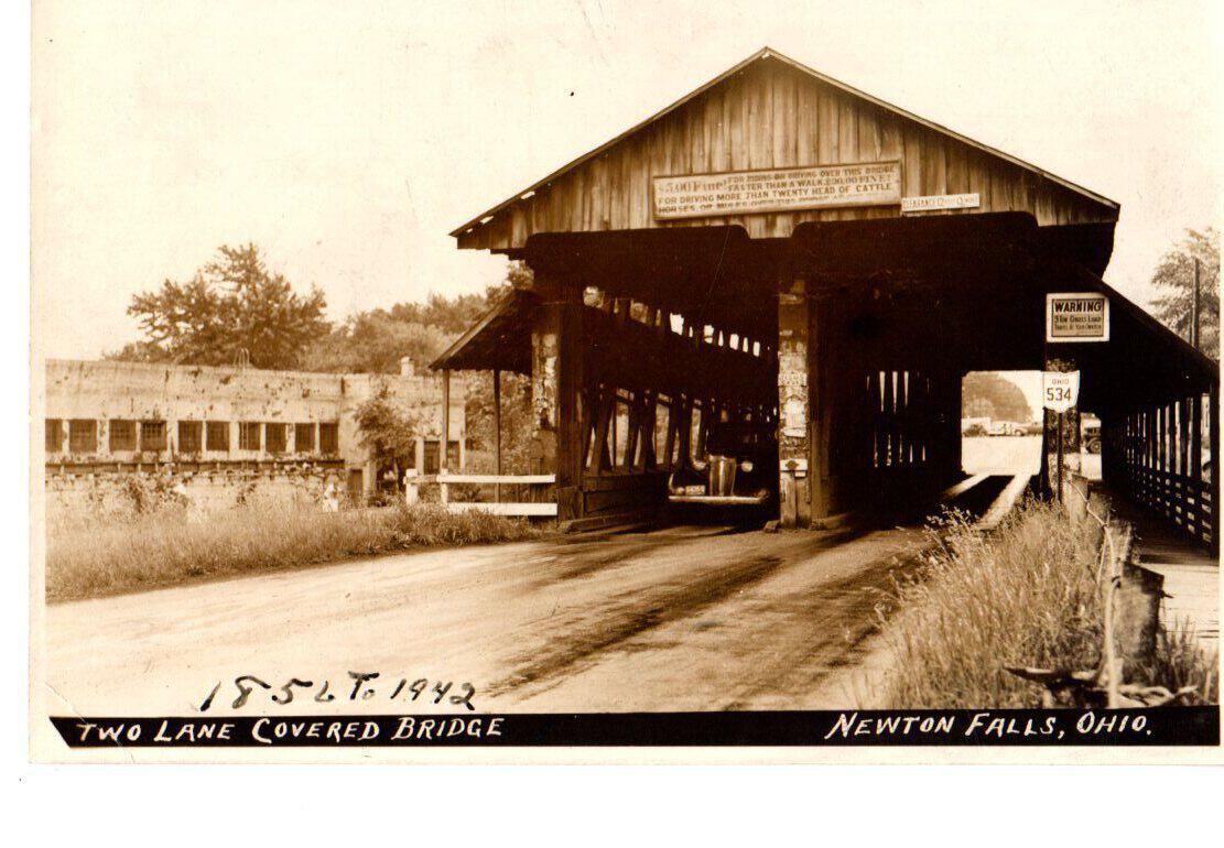 Multiple copies of a photo showing a car passing through the double covered bridge over the west branch of the Mahoning River. The bridge was built in 1856 and demolished in 1942.
