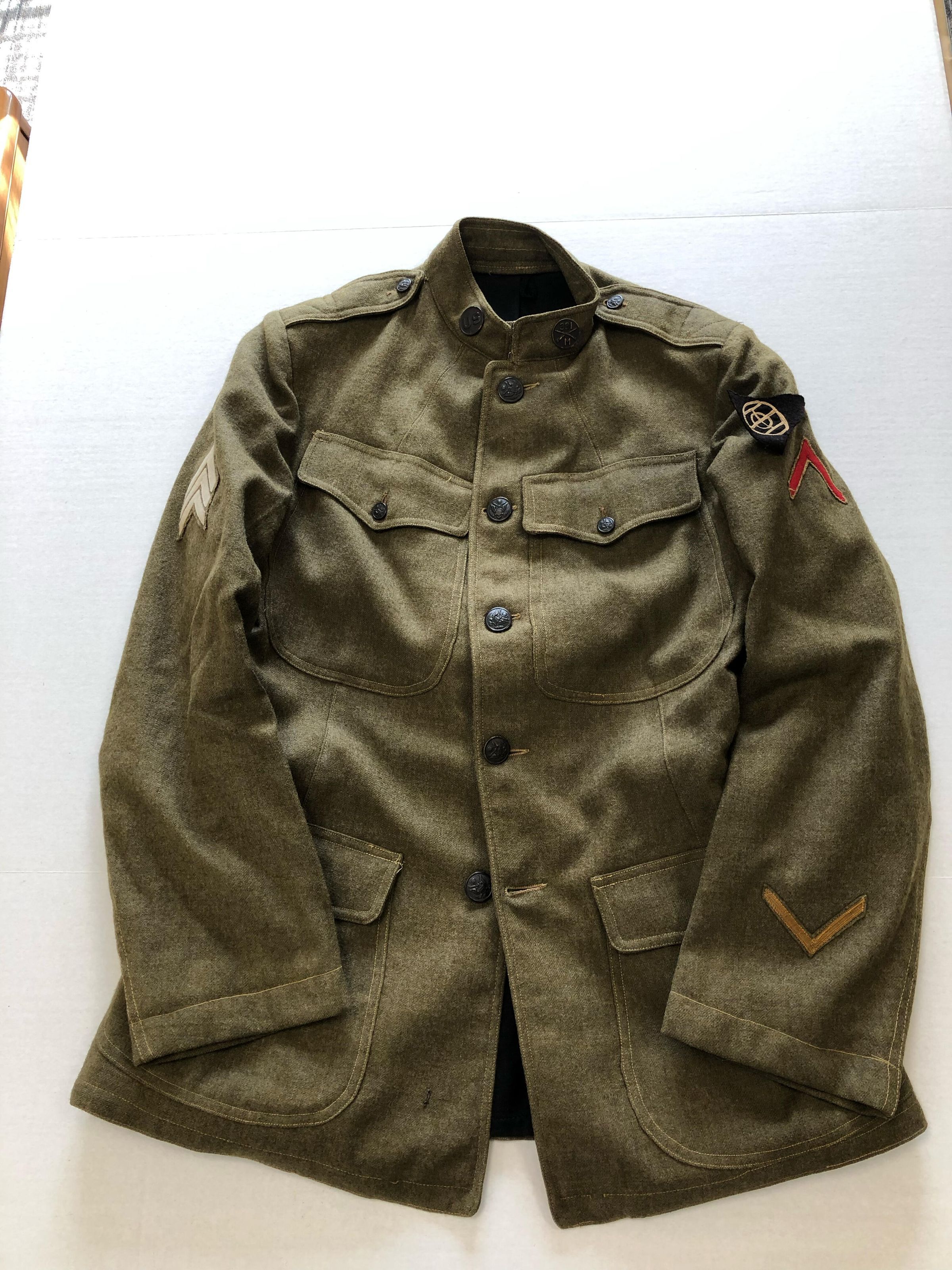 Uniform worn by George L. Lyon (1896-1977) during World war I. Mr. Lyon served in the Army from 1917-1919 and was stationed in France. Not wanting to return home in his frayed and worn uniform, he requested that his wife, Ada, send money to purchase the new uniform for his homecoming. The stripes on the right shoulder are for his sergeant's rank. One the sleeves are the black Ohio 83rd Division patch, the red stripe indicating overseas duty and the gold stripe when corporal rank was achieved.Acquisition