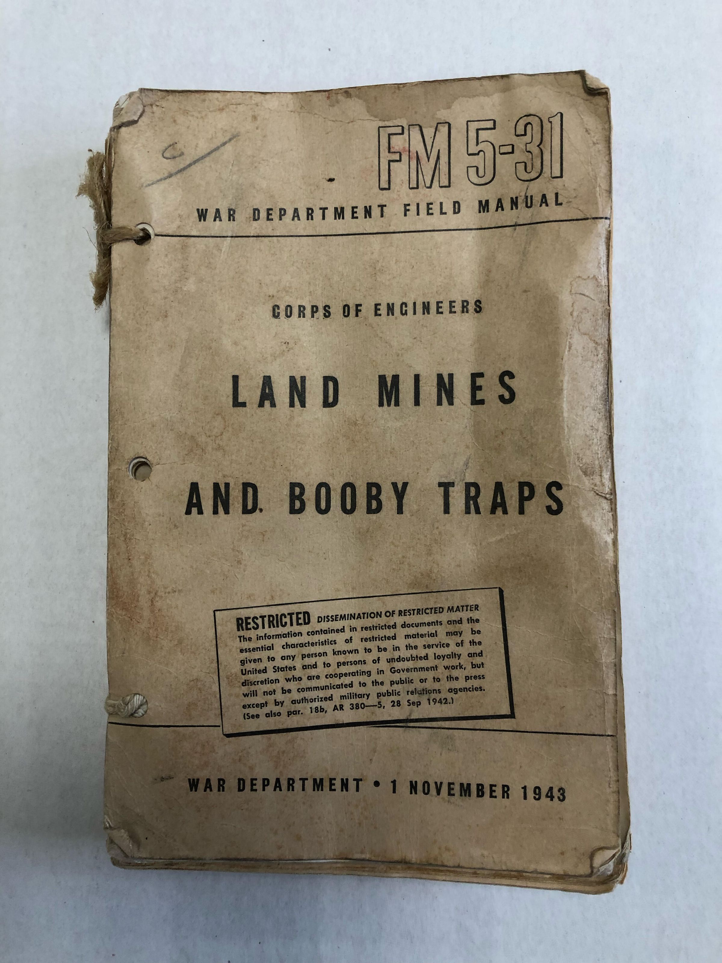World War II land mines and booby traps field manual. Published by the War Department. Book is numbered FM 5-31 and dated November 1, 1943.Acquisition