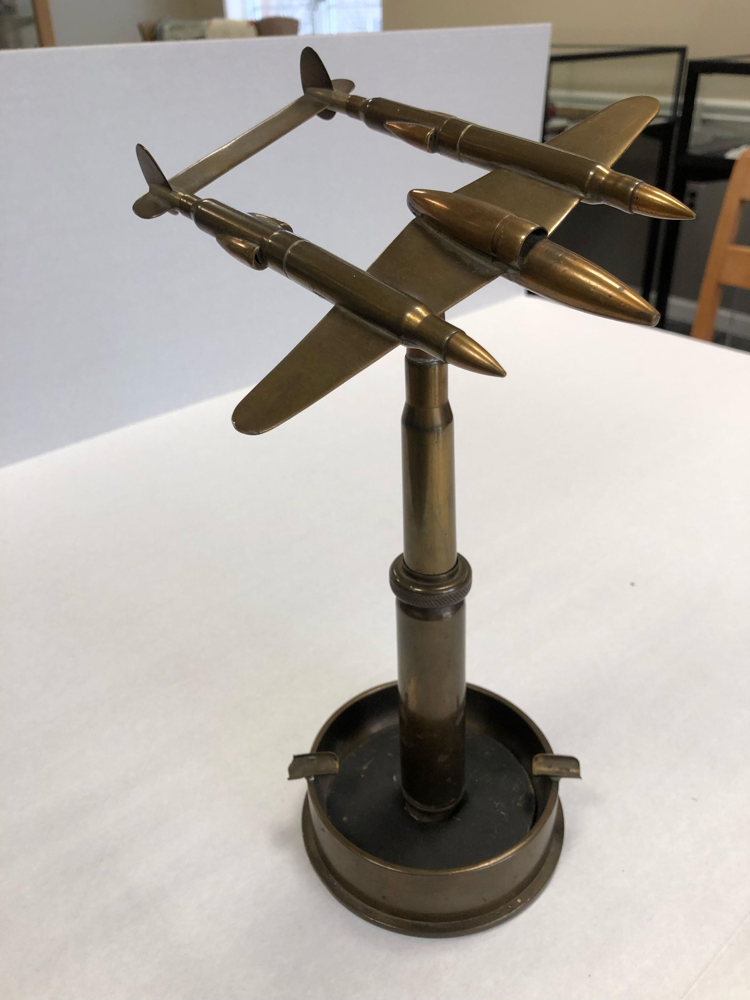 A statue/ashtray made from World War II military ordnance. Circa 1940s. Belonged to Andrew Bednarcik.Collection