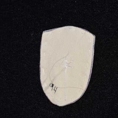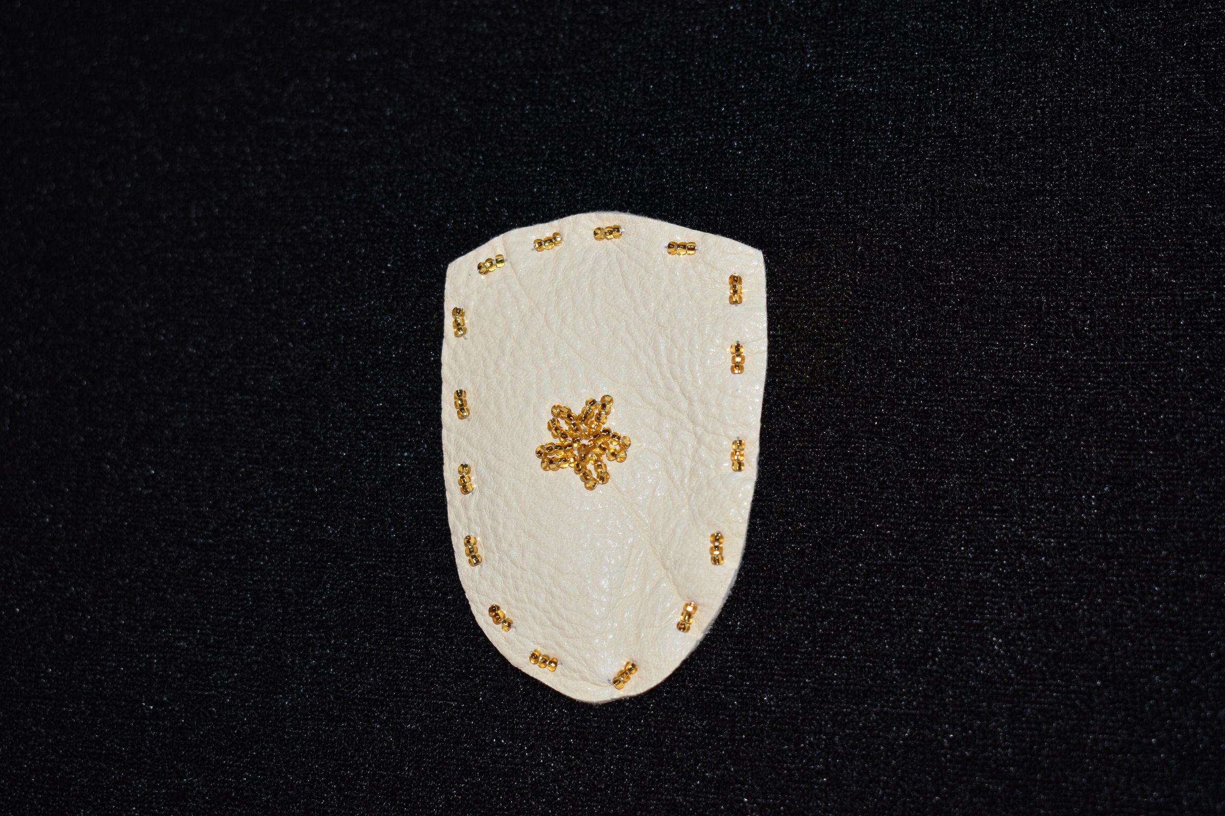 Vamp donated by Jackie Cree. Gold glass seed beads on leather.