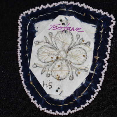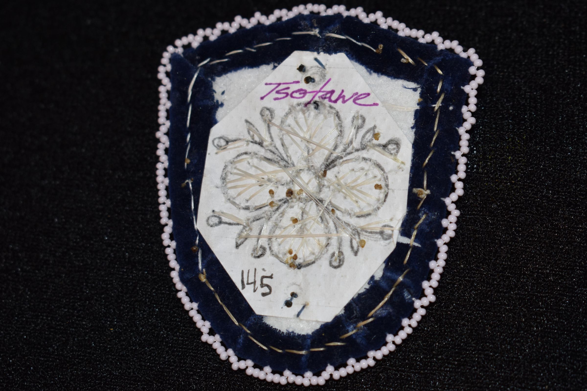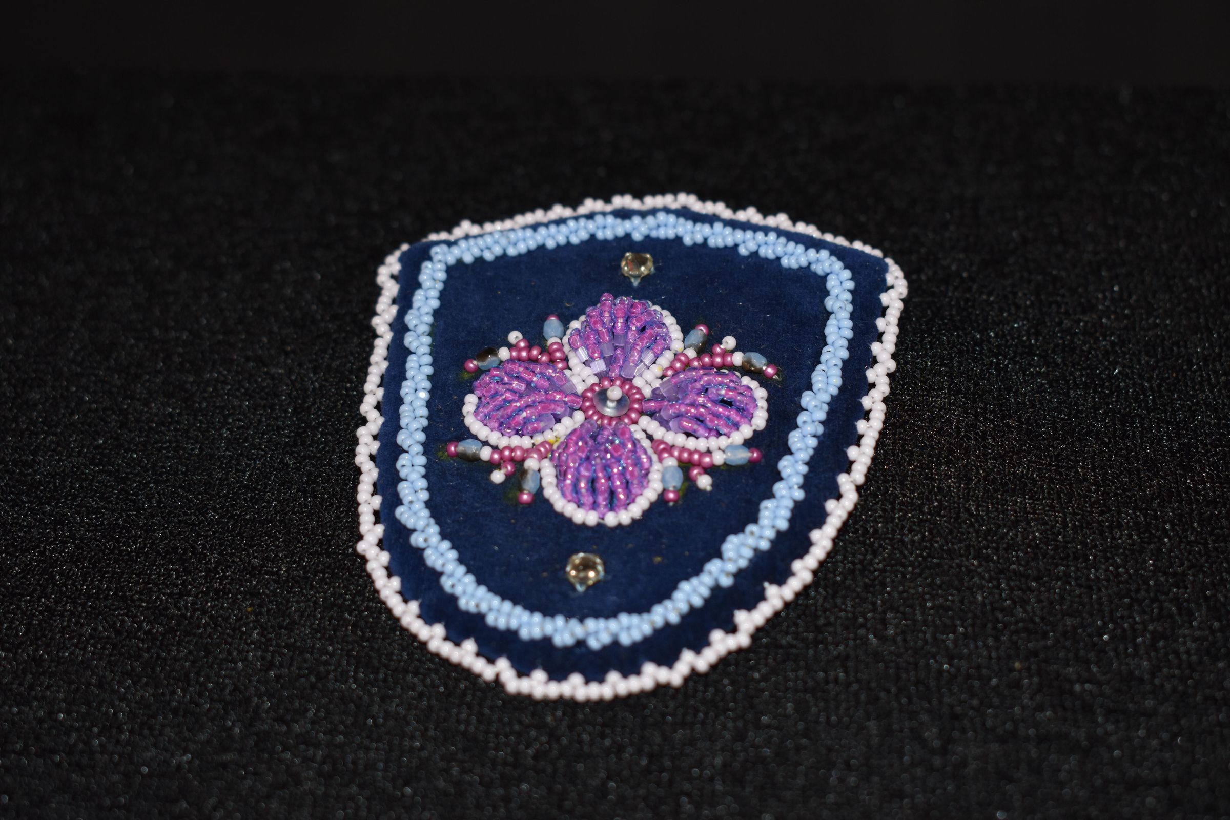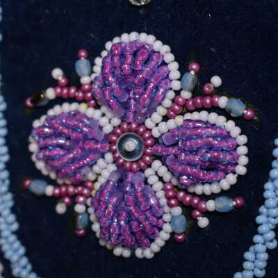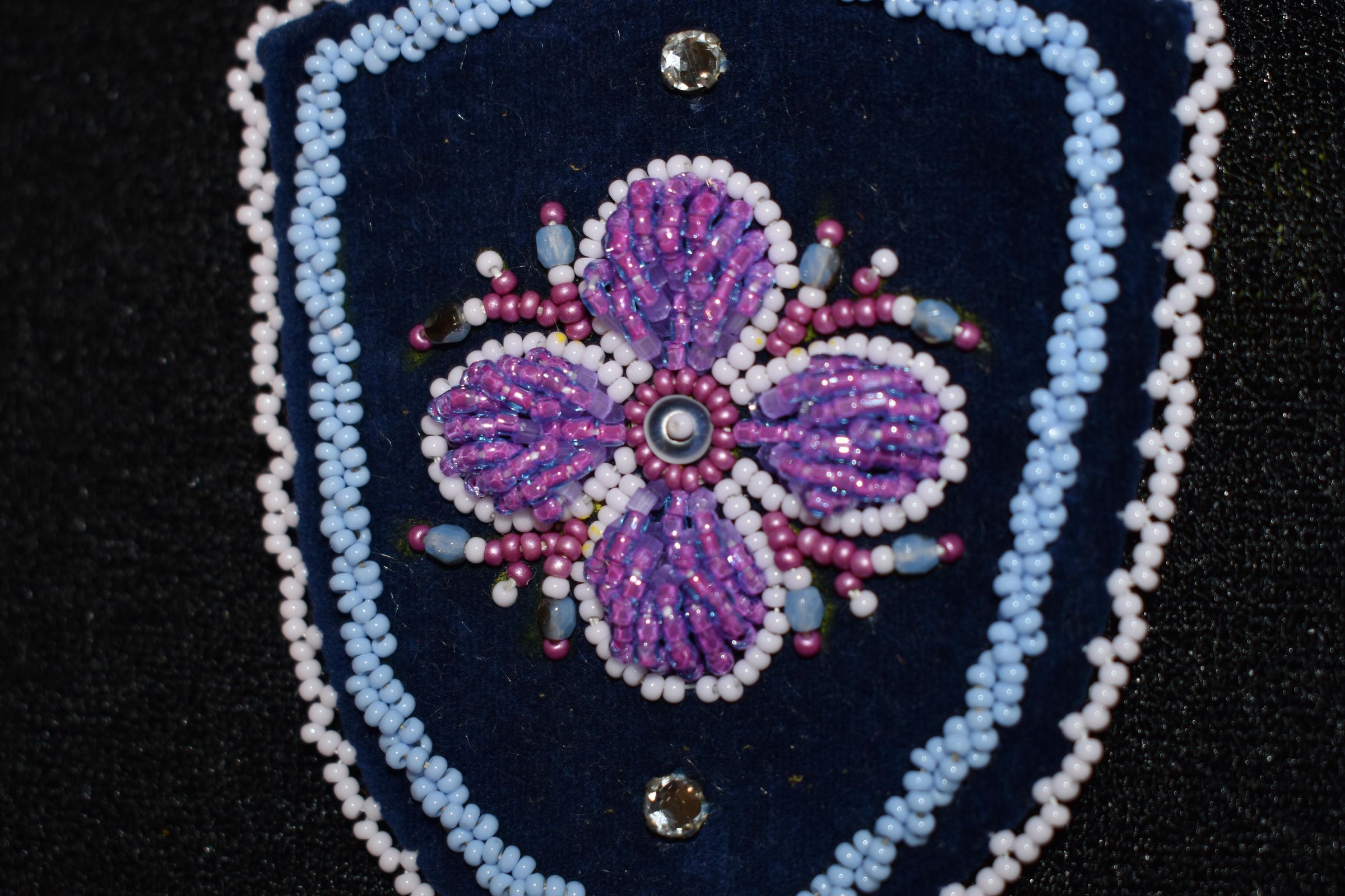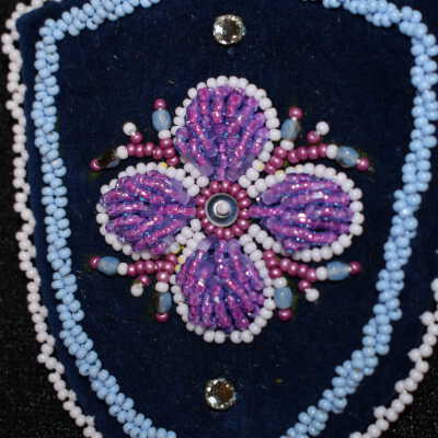 Large pearl centre bead, pink, white, and purple glass seed beads for the flower. Large blue beads. Crystals placed on top and bottom. Blue glass seed beads along the side, ad well as white glass seed beads on edging. Beaded on pellon and faux suede.Cataloged By