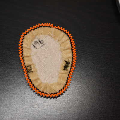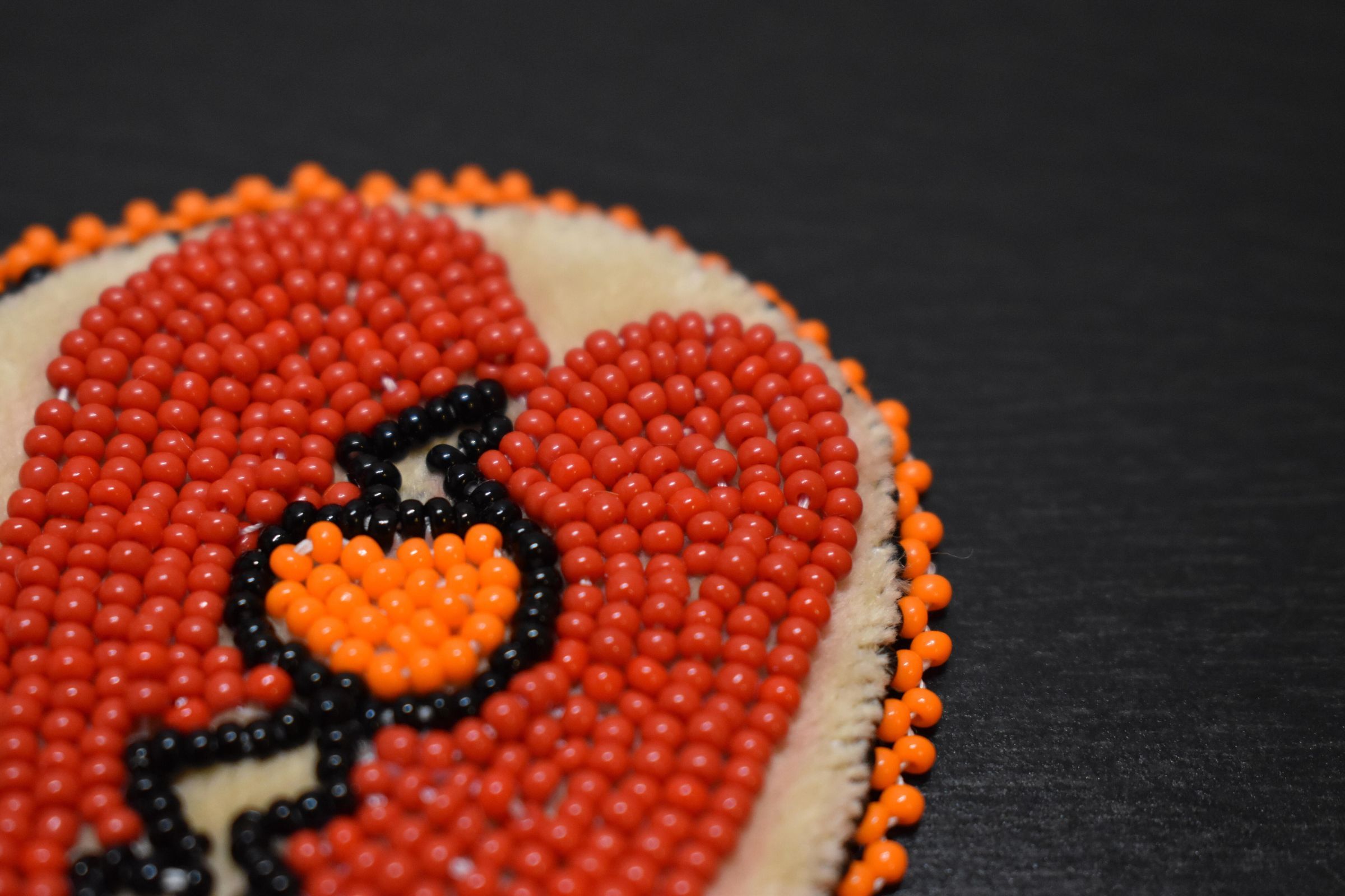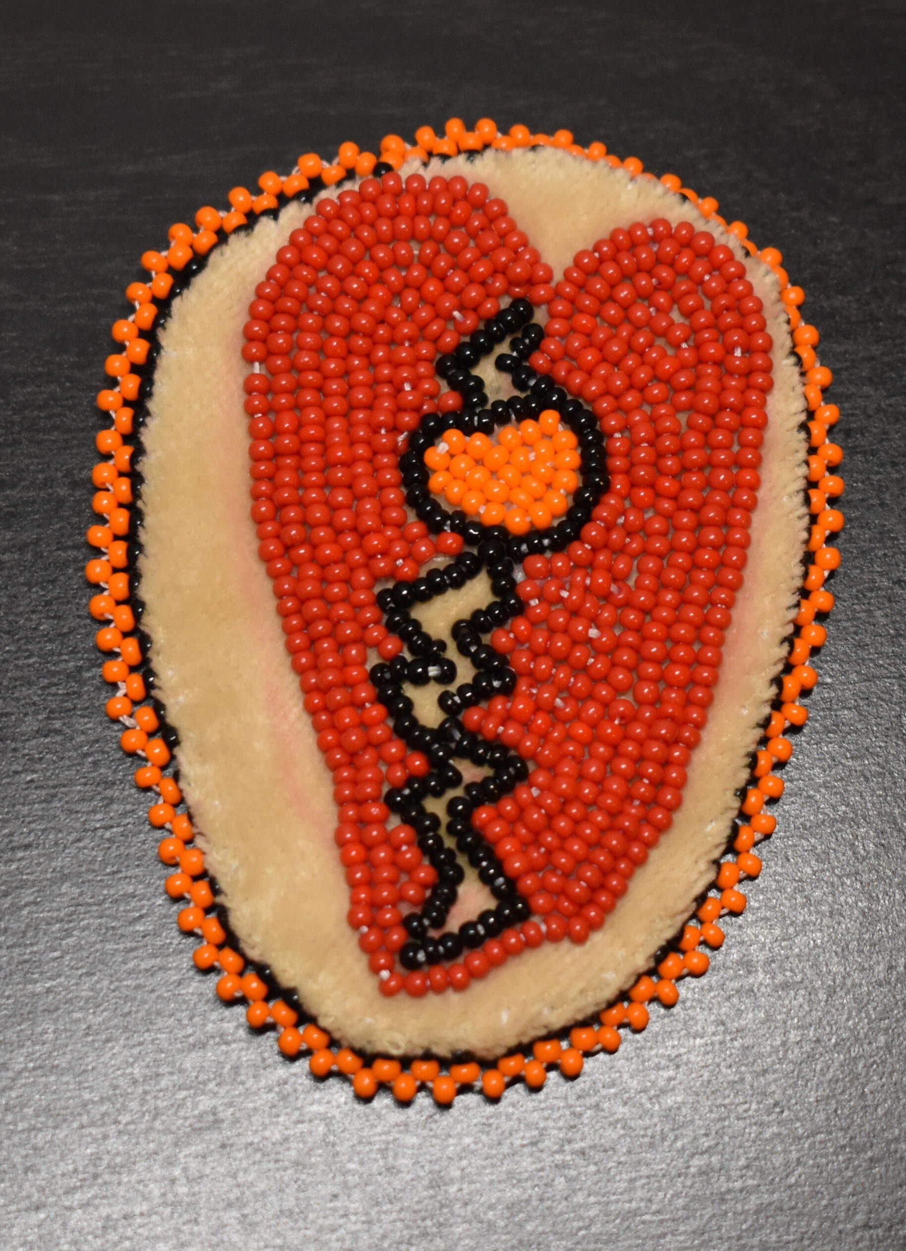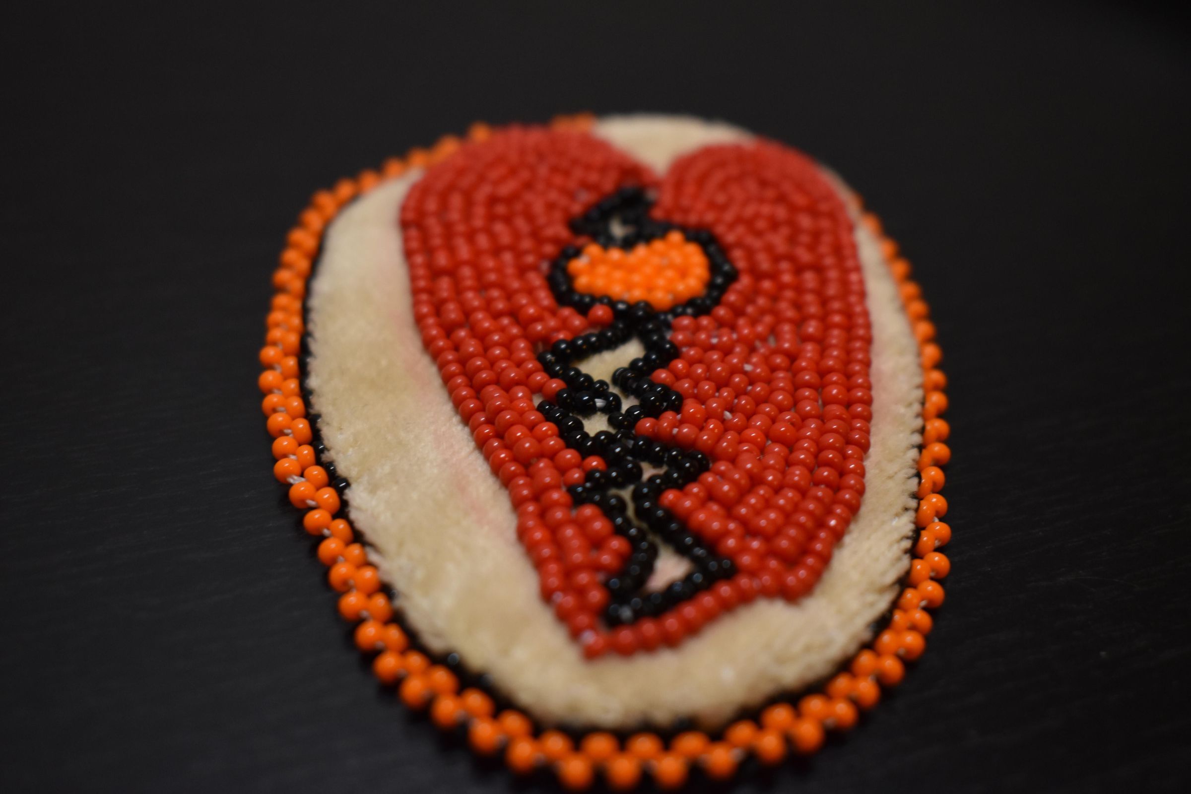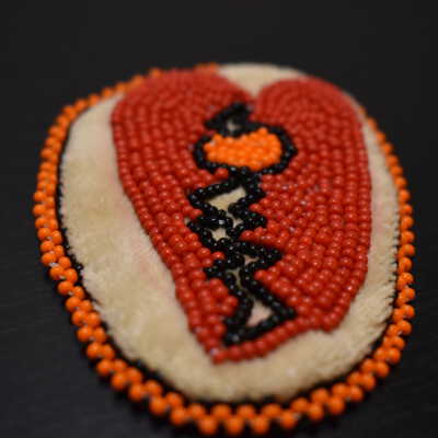 Red glass seed beads were used to make a heart, black glass seed beads were used to create a crack, orange glass see beads were used for the centre. Orange and black glass seed beads were used for the edging. Beaded on pellon and faux suede.Cataloged By